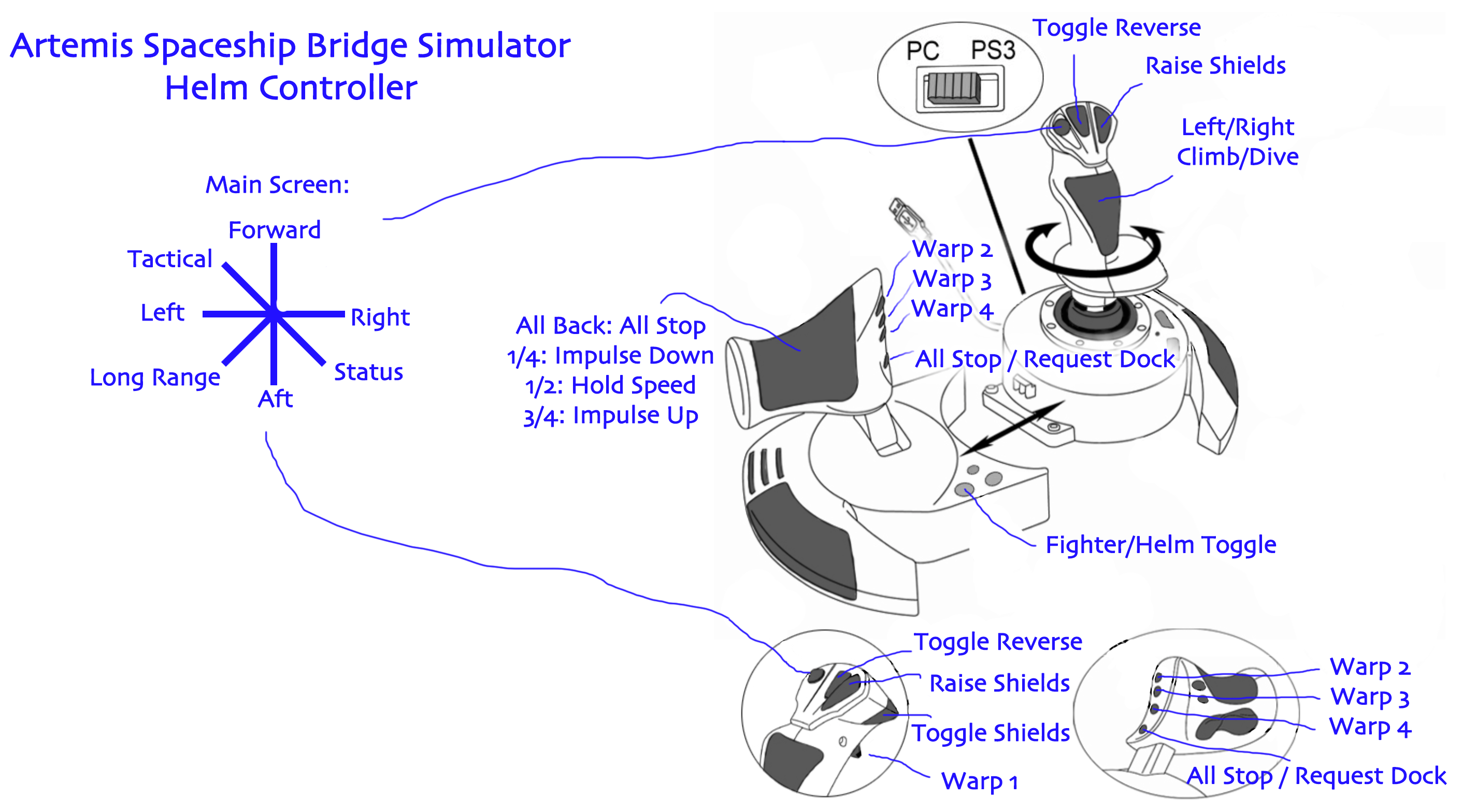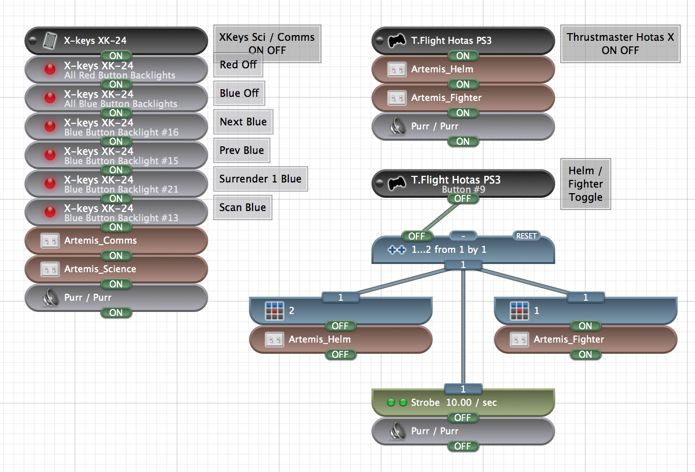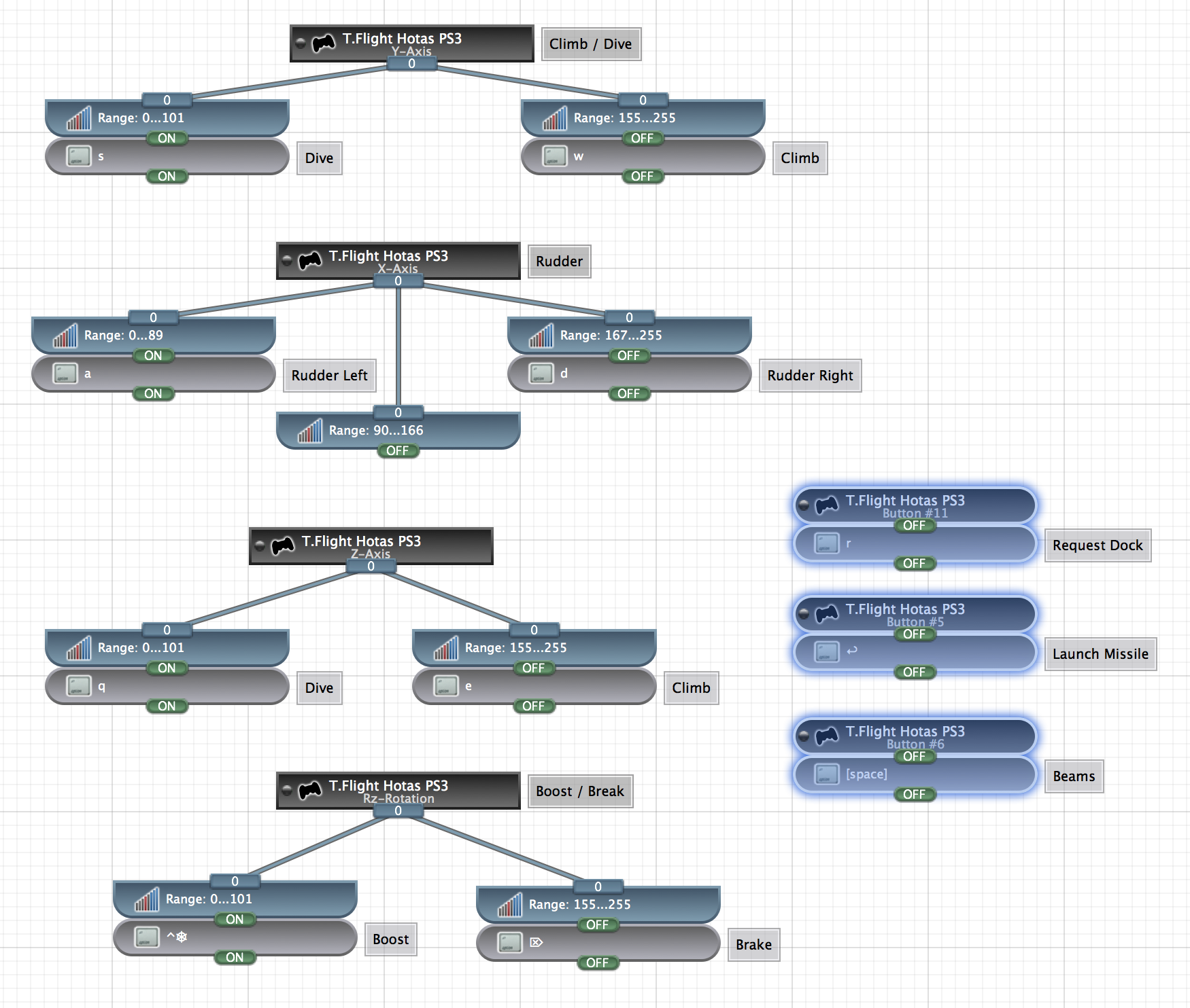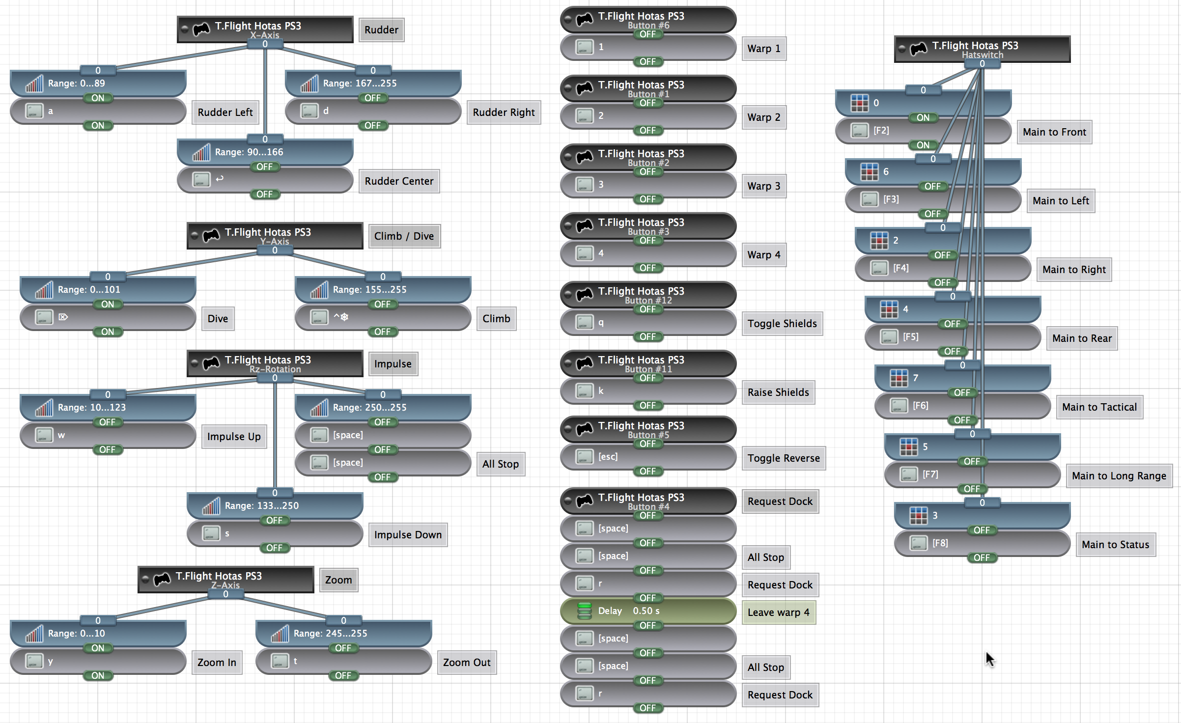 With this setup, the device becomes active and configured when it is plugged in. The joystick defaults to a Helm setup, but is swapped to Fighter using the joystick's SE button. The Comms setup runs scripts to request surrenders, hail friendlies, and build nukes. i.e. pressing "3" will request surrenders from the nearest 3 ships.