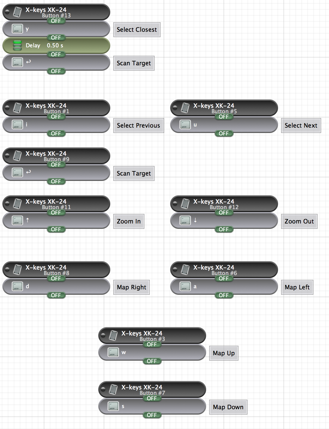 If you don't have an XKeys 24 or a Thrustmaster T-Flight Hotas X, you can easily reconfigure the scripts to use your native Mac keyboard or your device. See the ControllerMate help.