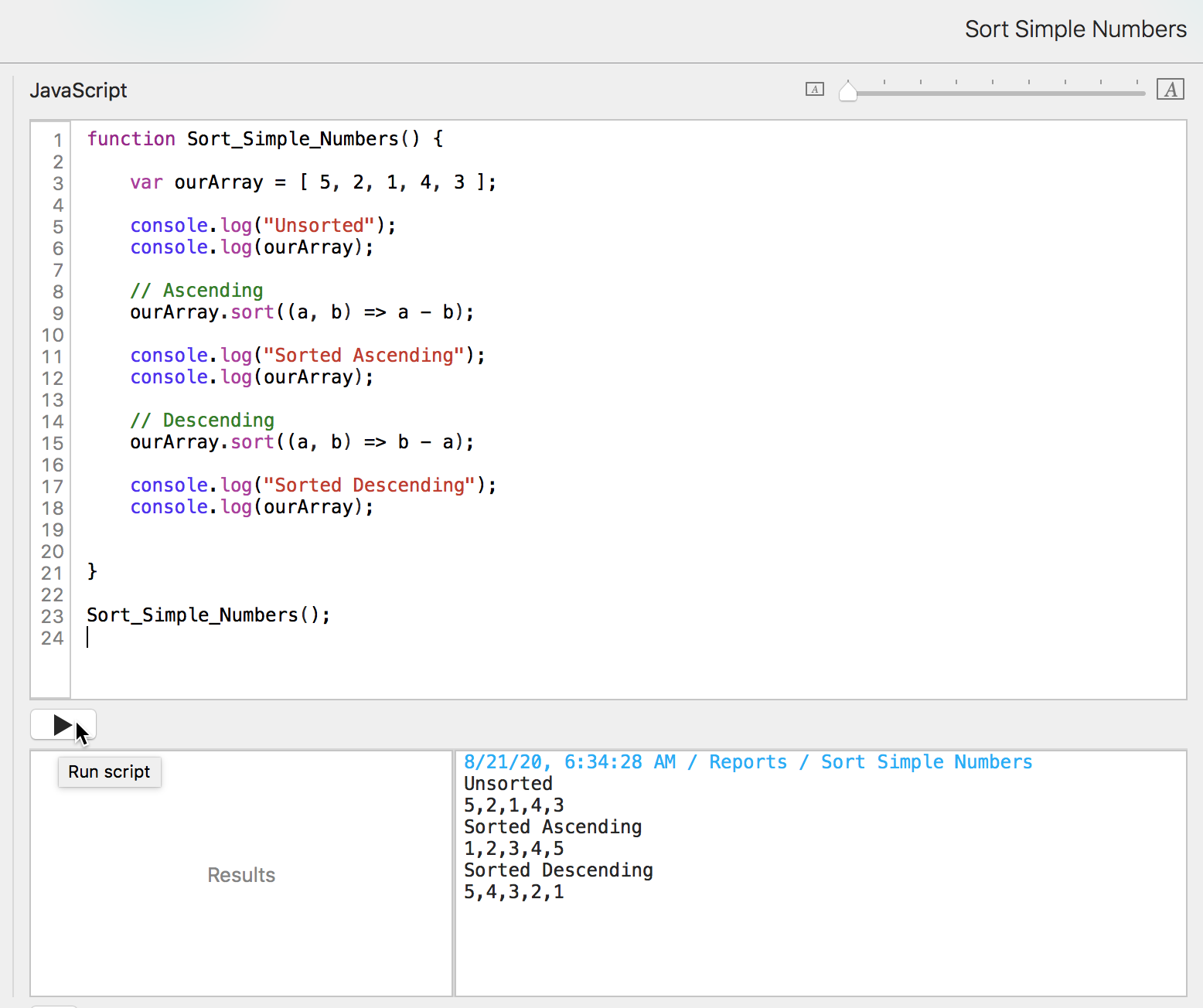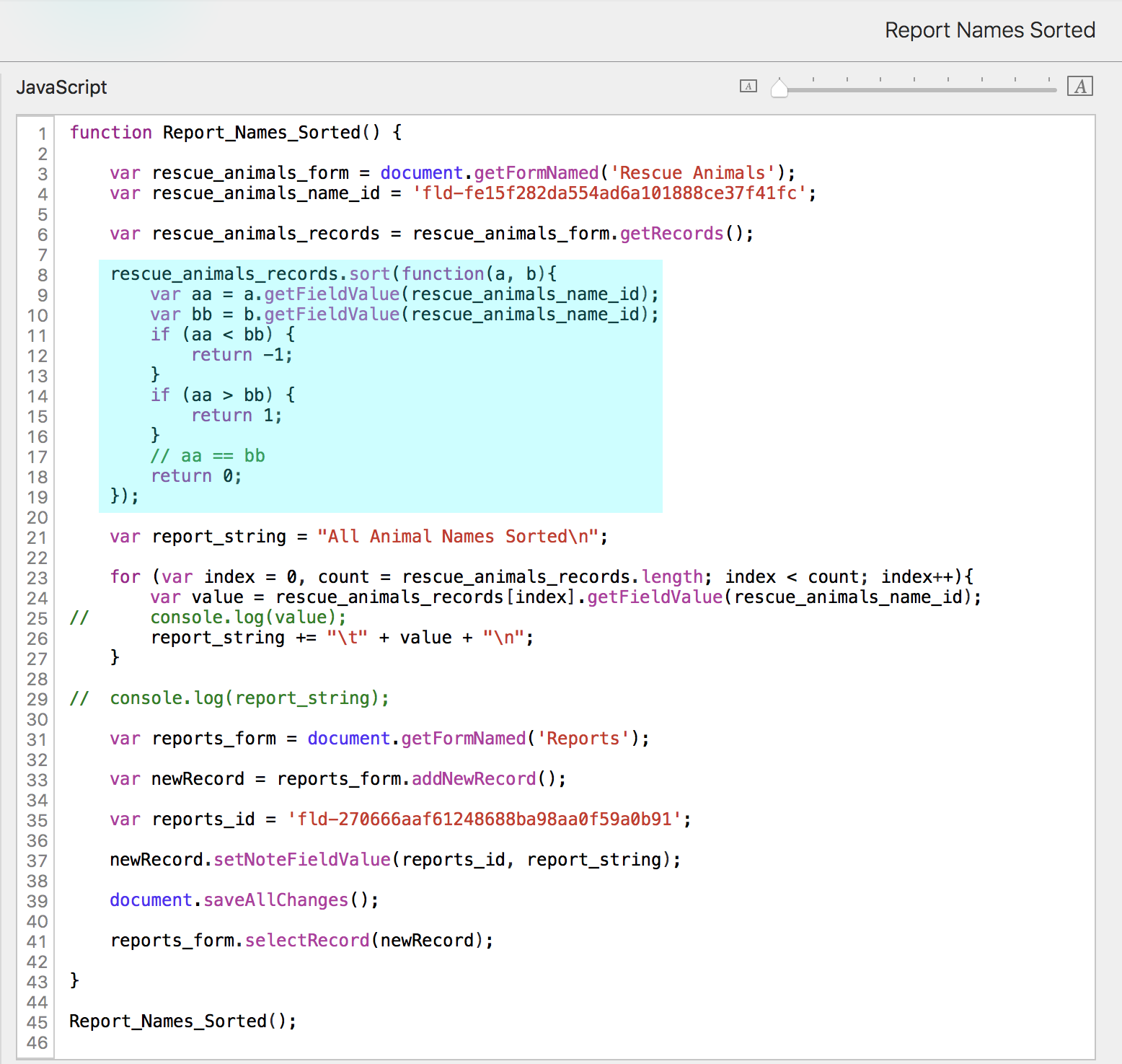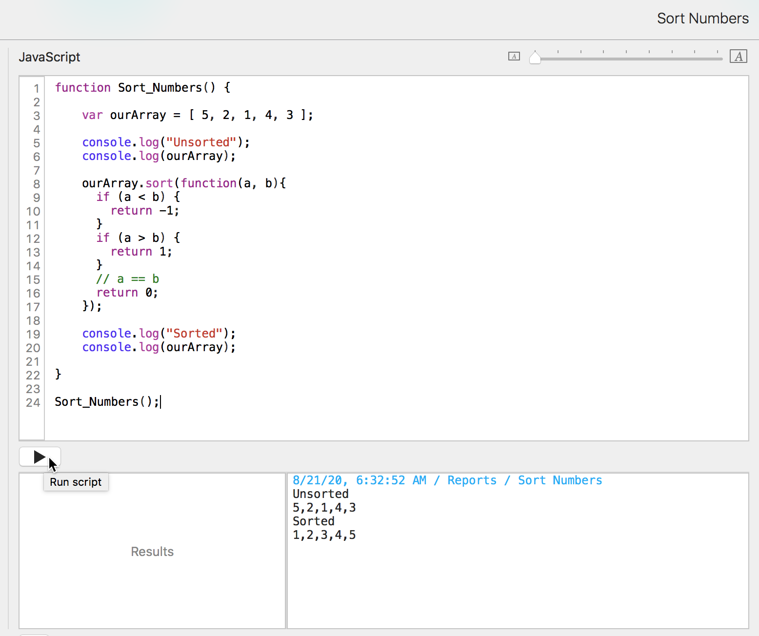 In Tap Forms, we can sort arrays using JavaScript's array.sort() function. While there are several nuanced syntaxes for this that you can easily find if you search the Internet for "JavaScript array sort", we're going to focus on the following one, as it can apply to any array sort that you are likely to do in Tap Forms. If you already know JavaScript, use whatever you want.