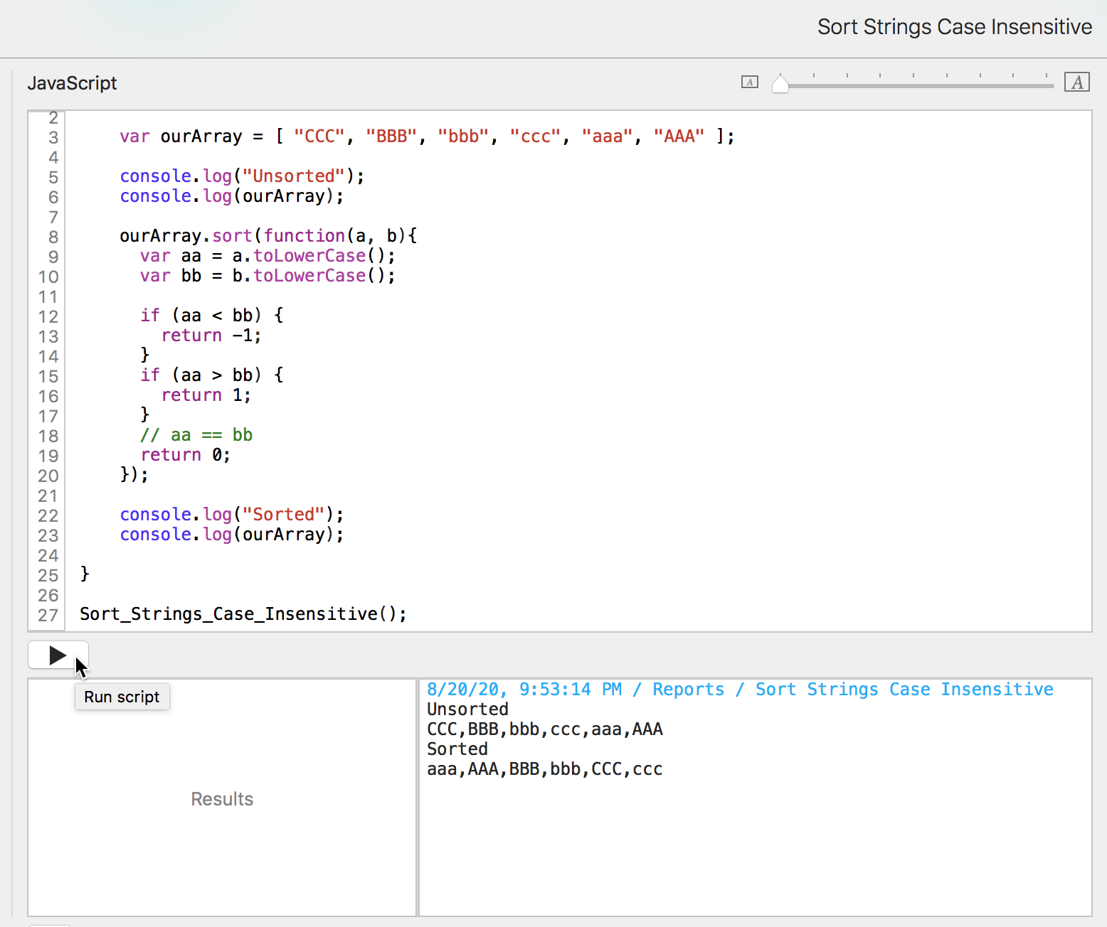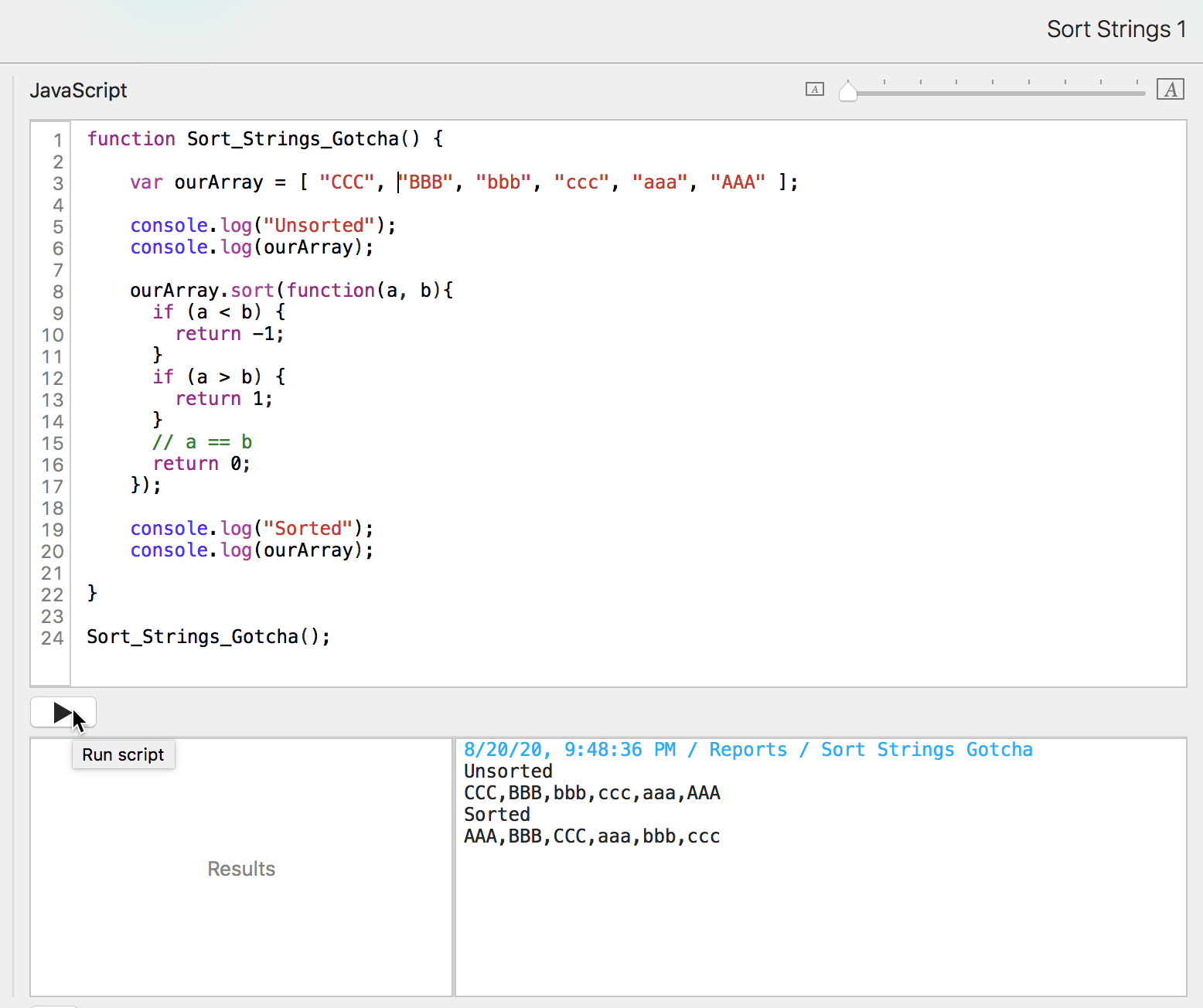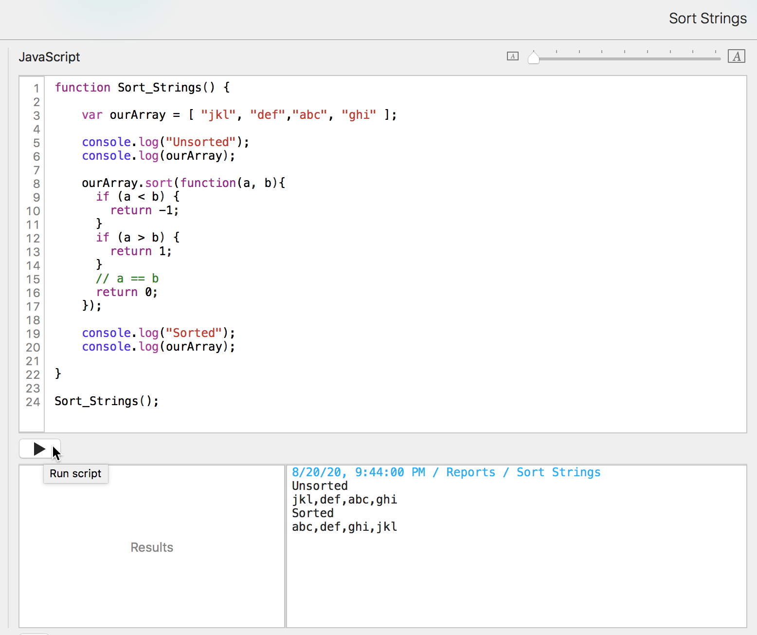 In Tap Forms, we can sort arrays using JavaScript's array.sort() function. While there are several nuanced syntaxes for this that you can easily find if you search the Internet for "JavaScript array sort", we're going to focus on the following one, as it can apply to any array sort that you are likely to do in Tap Forms. If you already know JavaScript, use whatever you want.