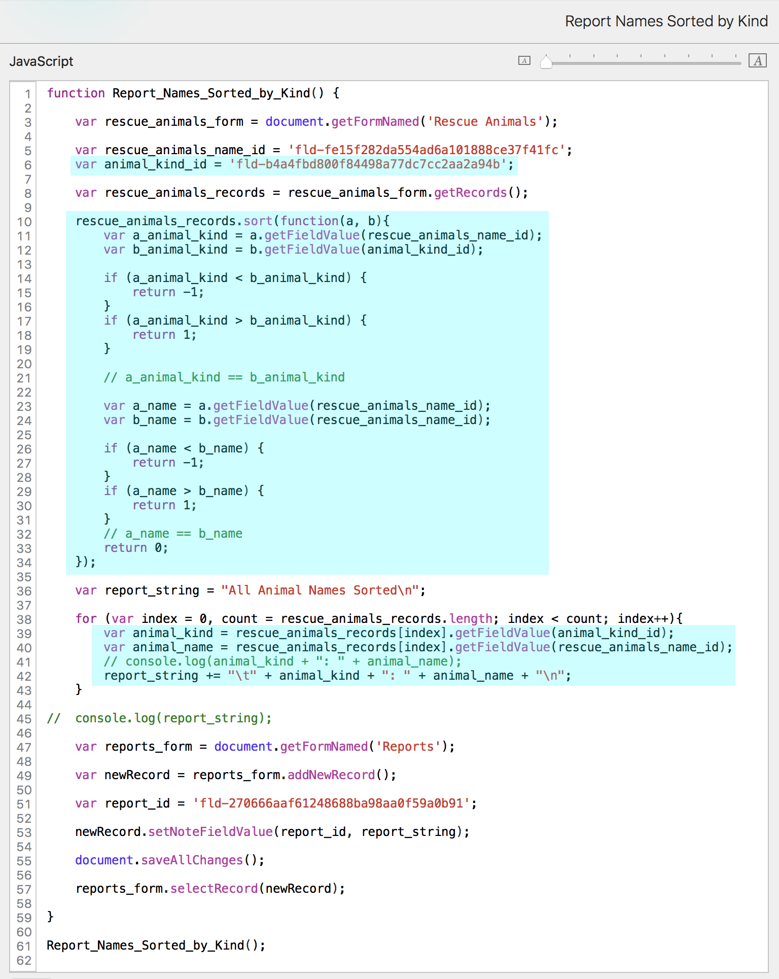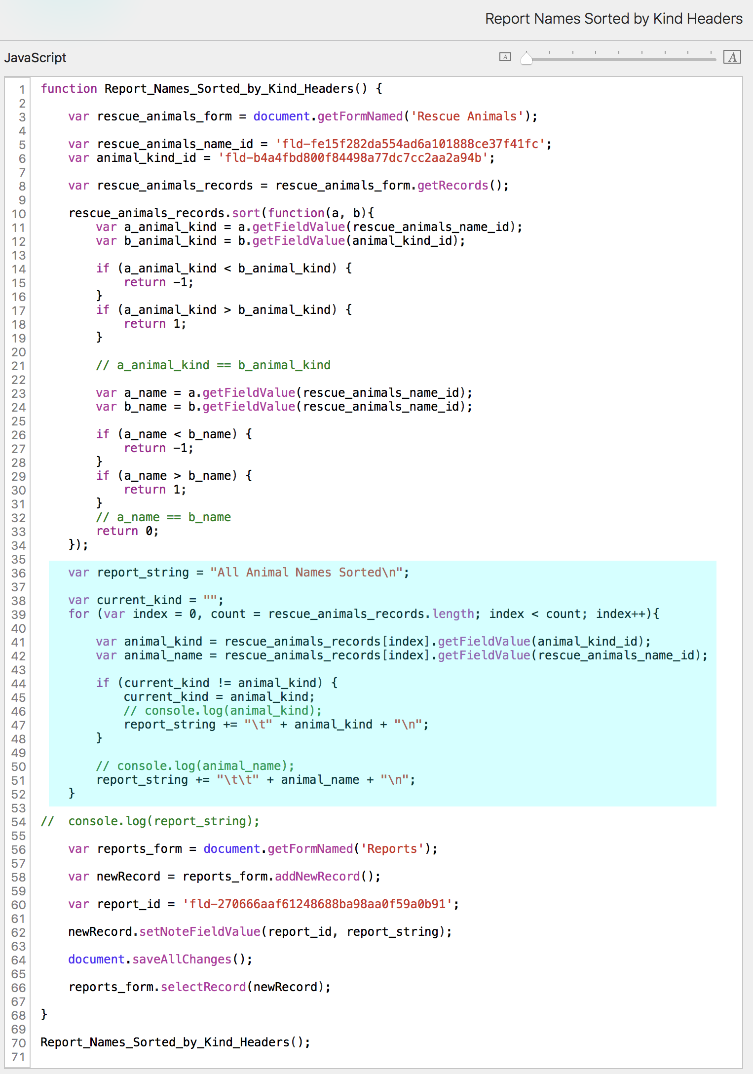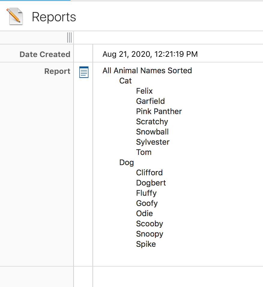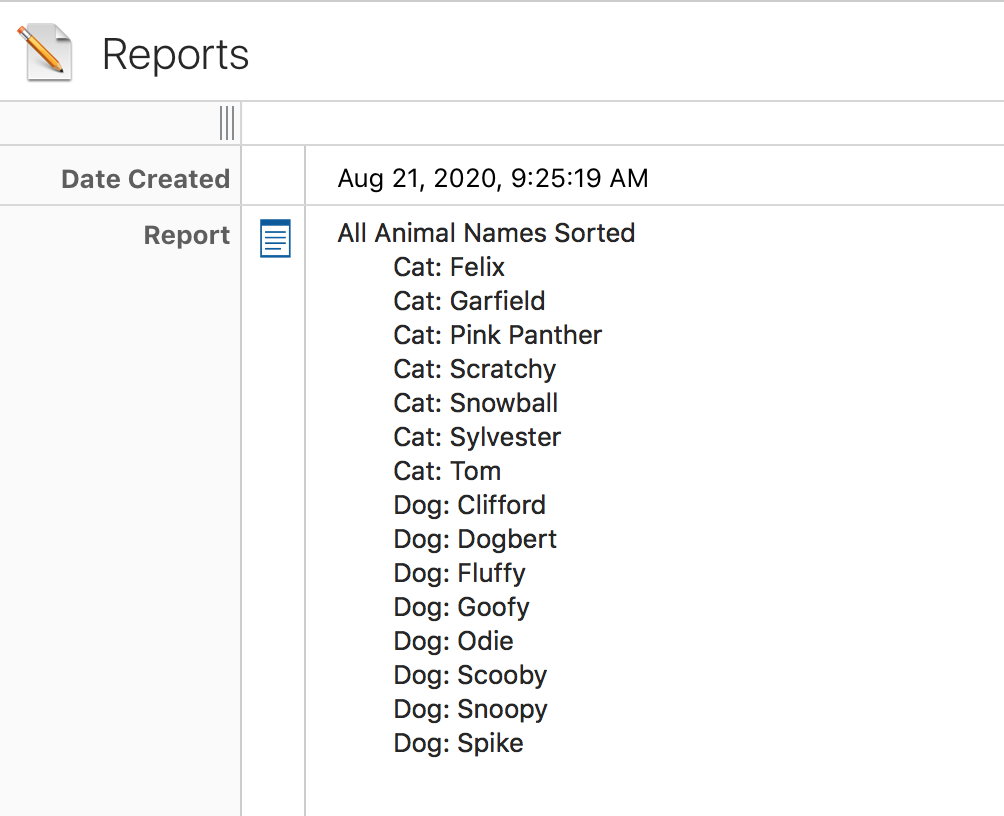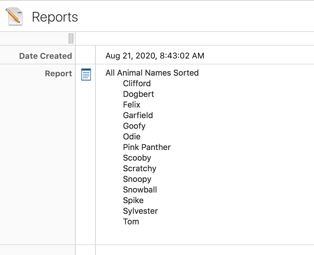 We add the sort function, get the animal names from our record fields, and run the report from the pulldown. It creates a report record and goes to it.