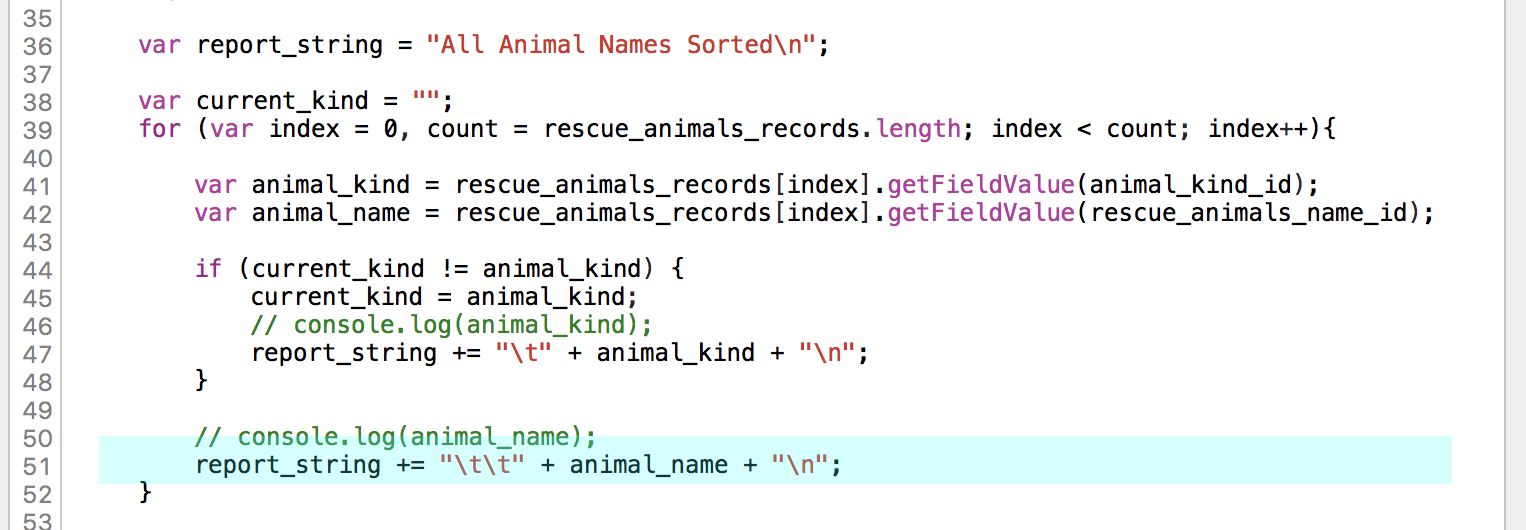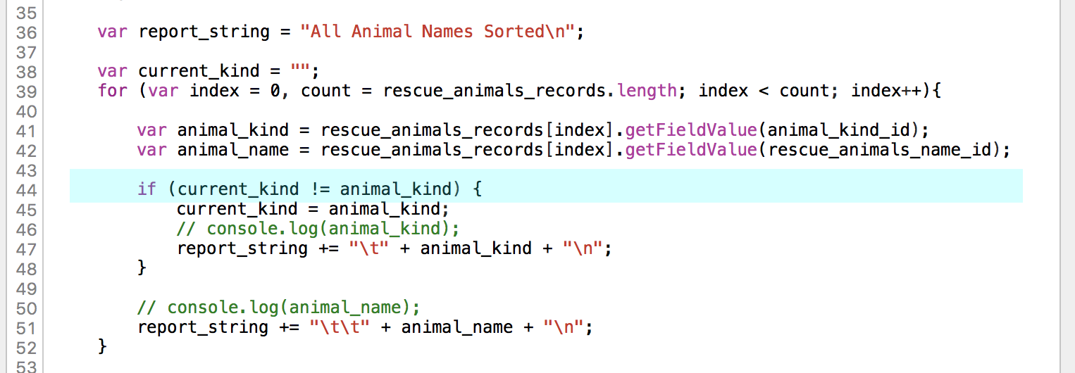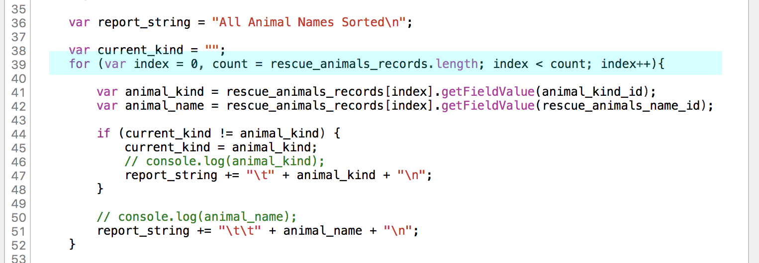 Here's our loop. The rescue_animals_records array is already sorted. You remember from Tap Forms JavaScript Scripting 101 or your other programming experience how a for loop works.