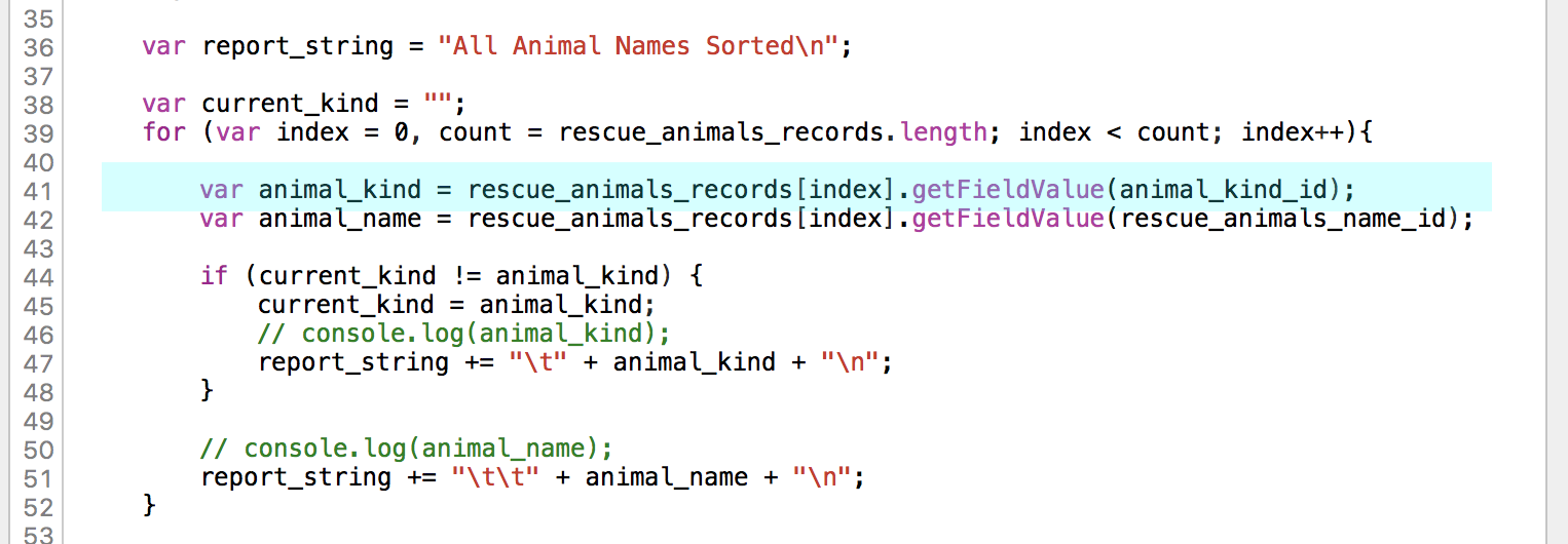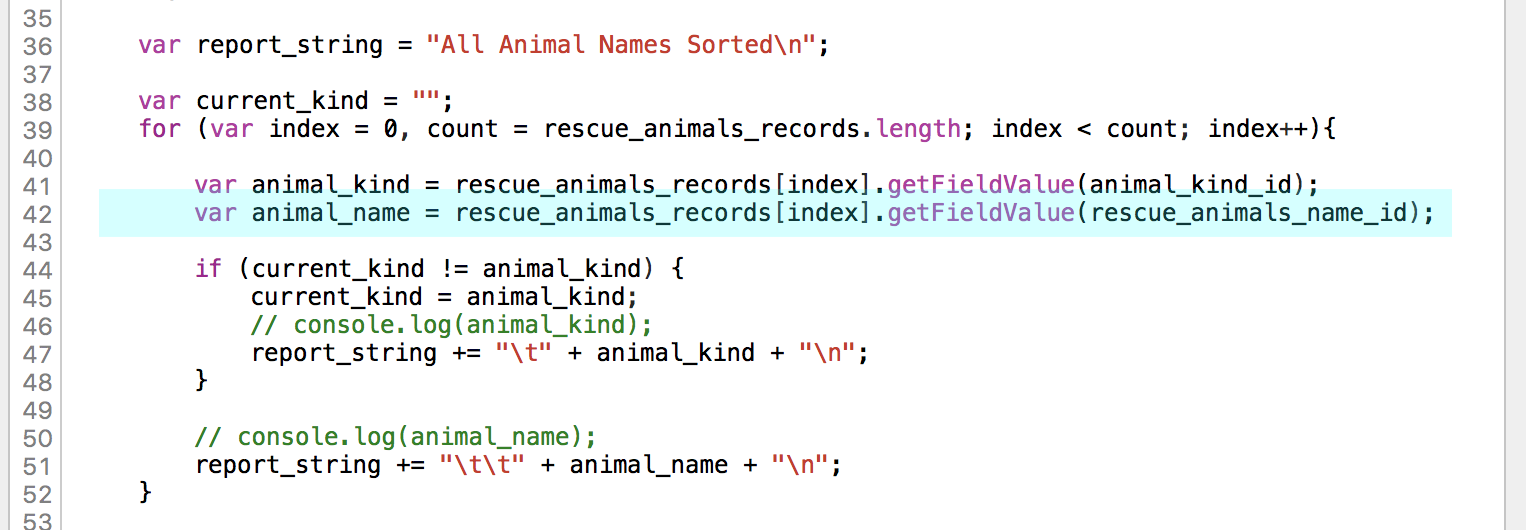 We get the animal name from the current record. We could do a console.log(animal_name); if we wanted to see which animal we were on.