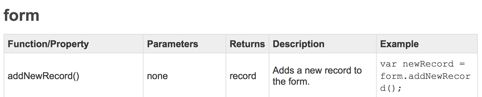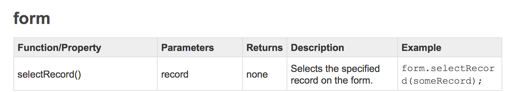 Now let's get Tap Forms to jump to that record, activating it. We consult the Tap Forms JavaScript API documentation again to see if there's something we can use.