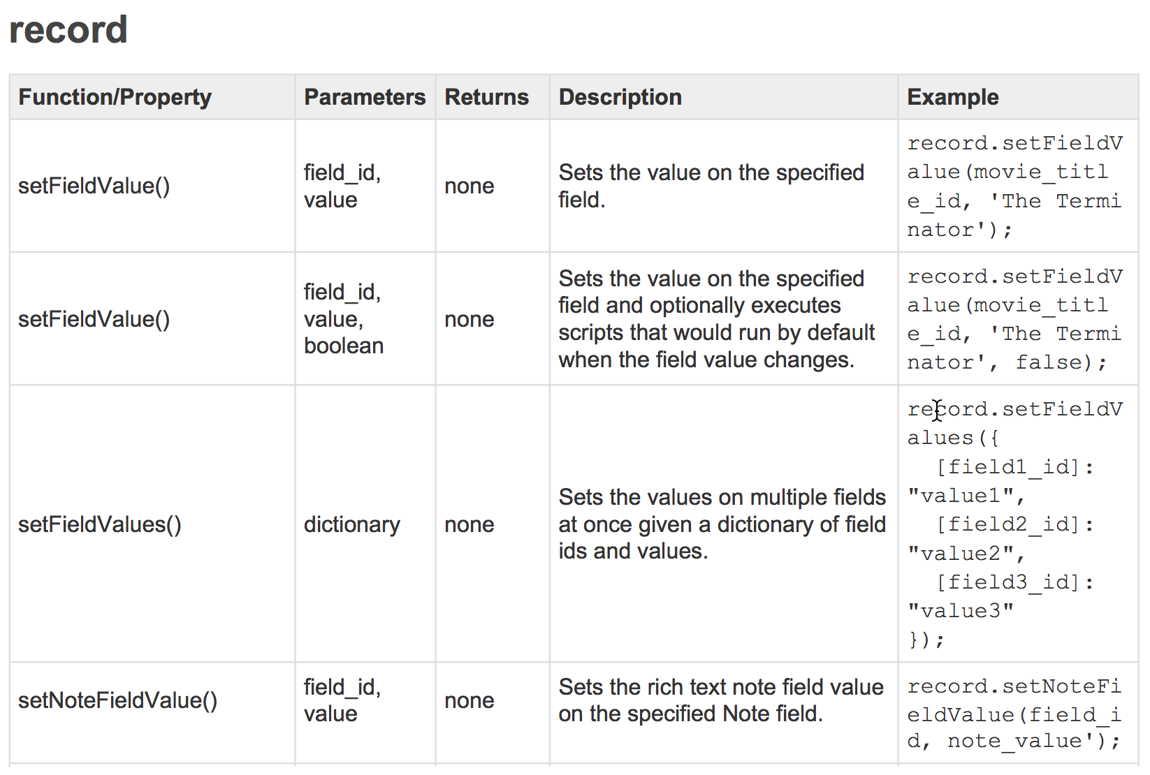 We consult the Tap Forms JavaScript API again, and we find four methods for setting a field object value on a record object.