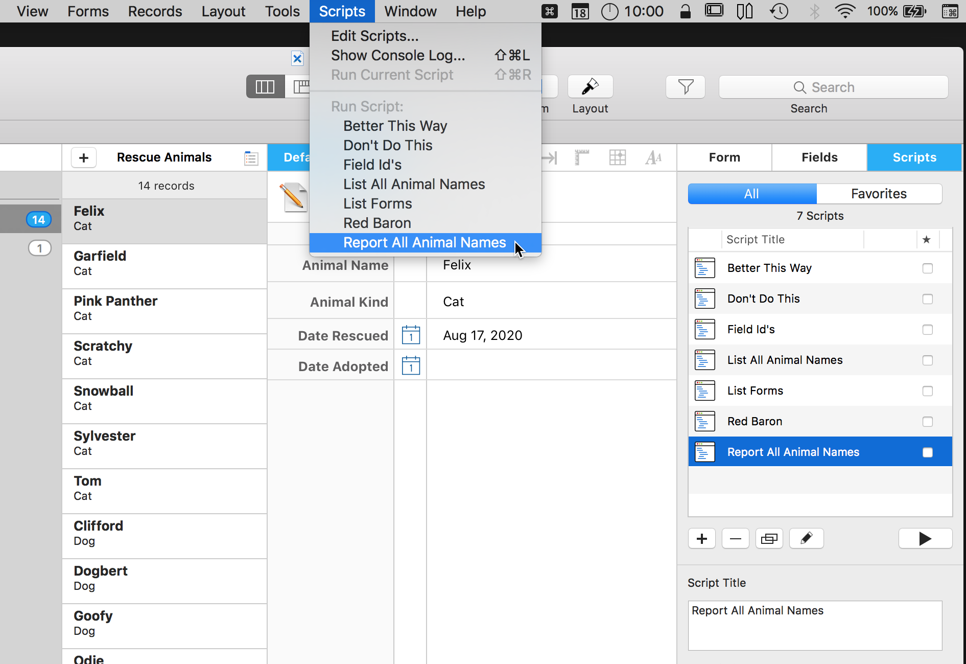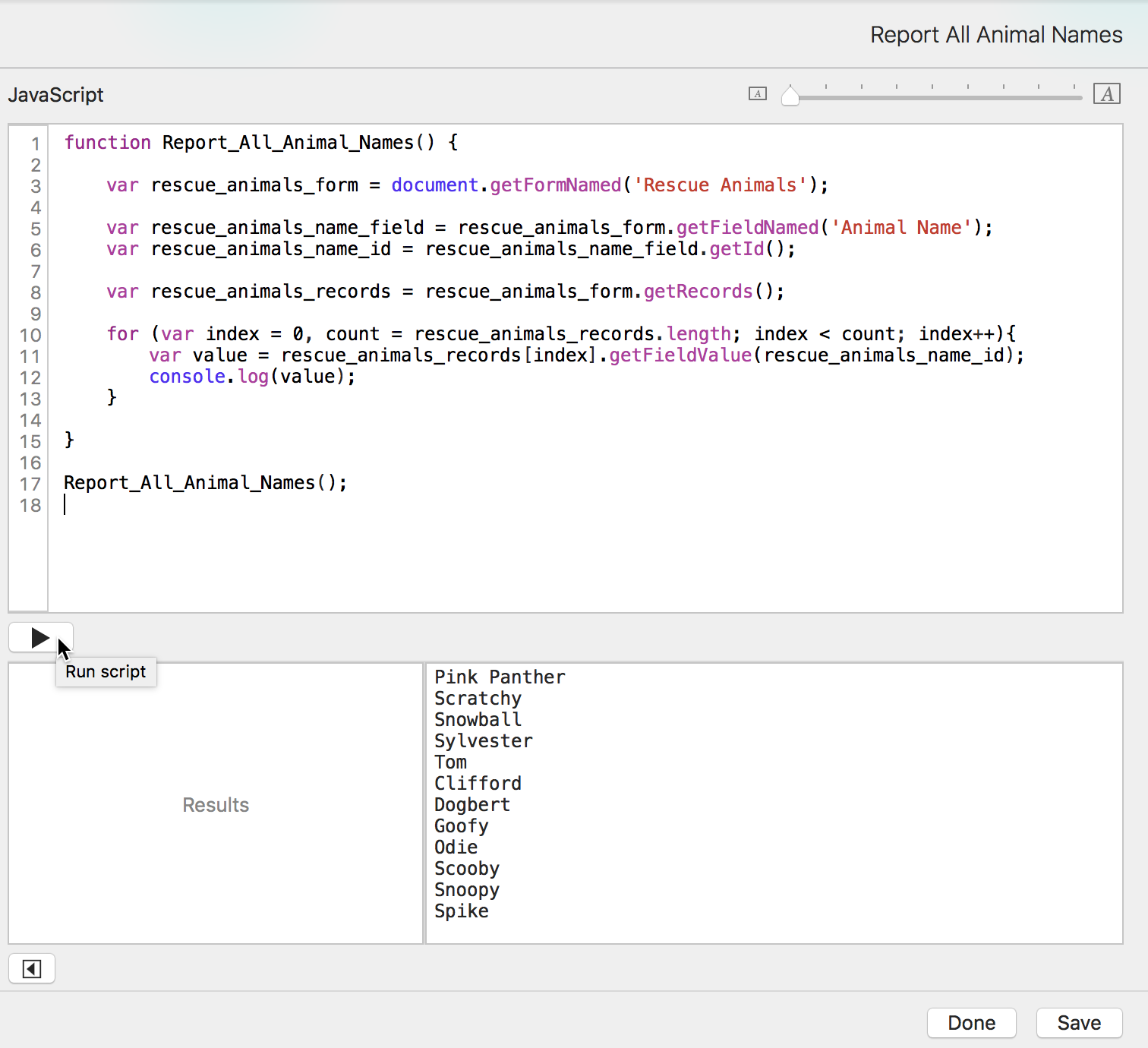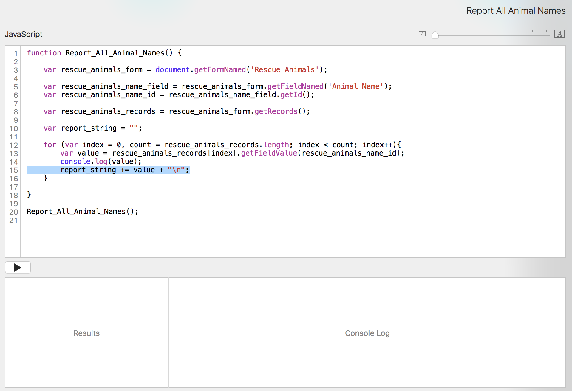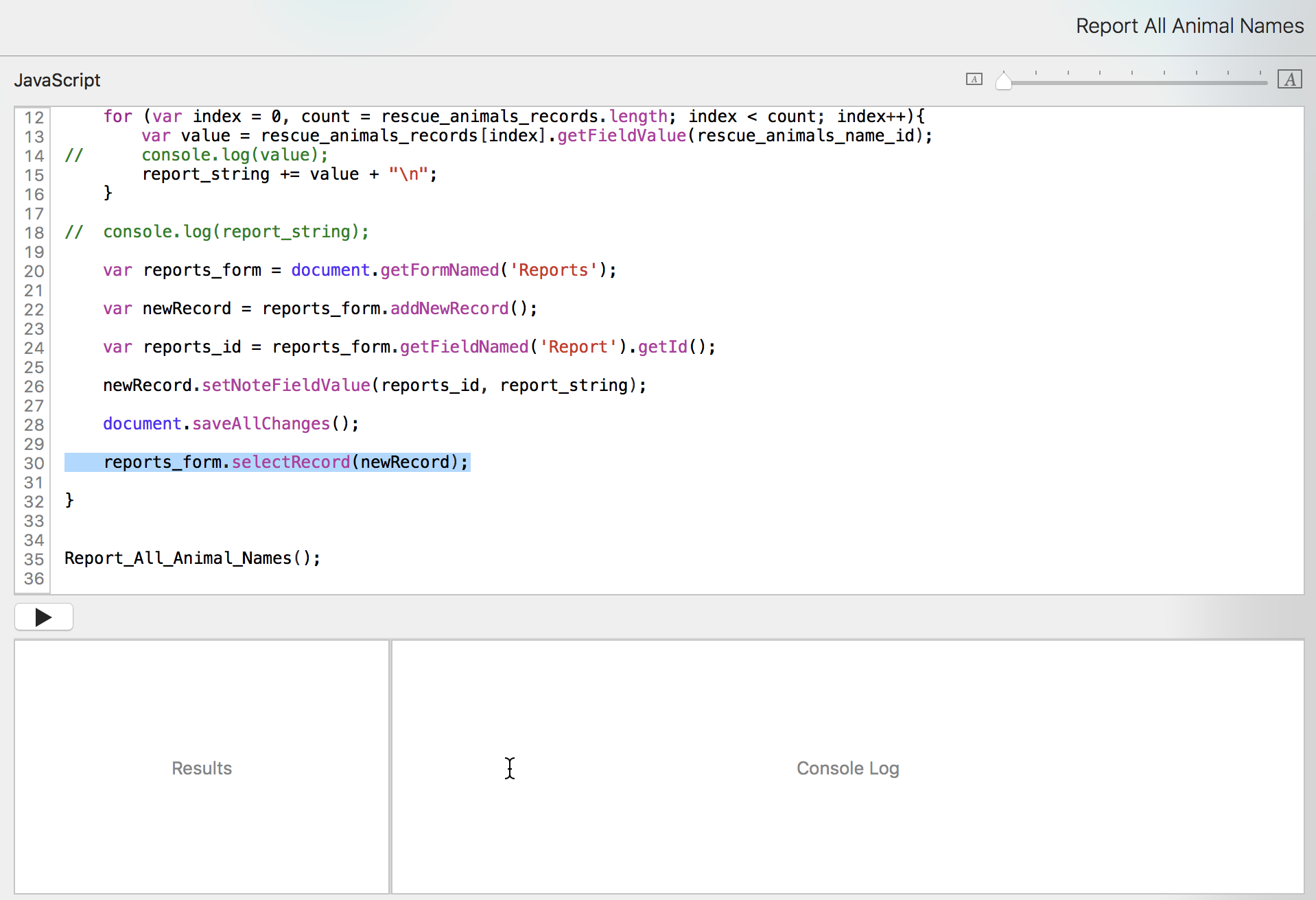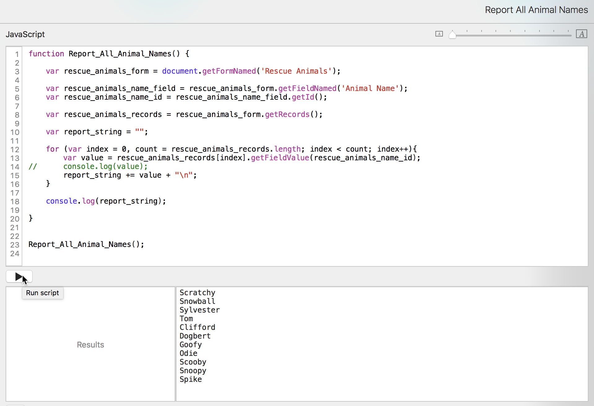 Now that we have that list of animal names, we want to put it into the Reports form. We don't want to have to open the console constantly to see the information. We just want to run the script from the pulldown menu and have it open to the report record.