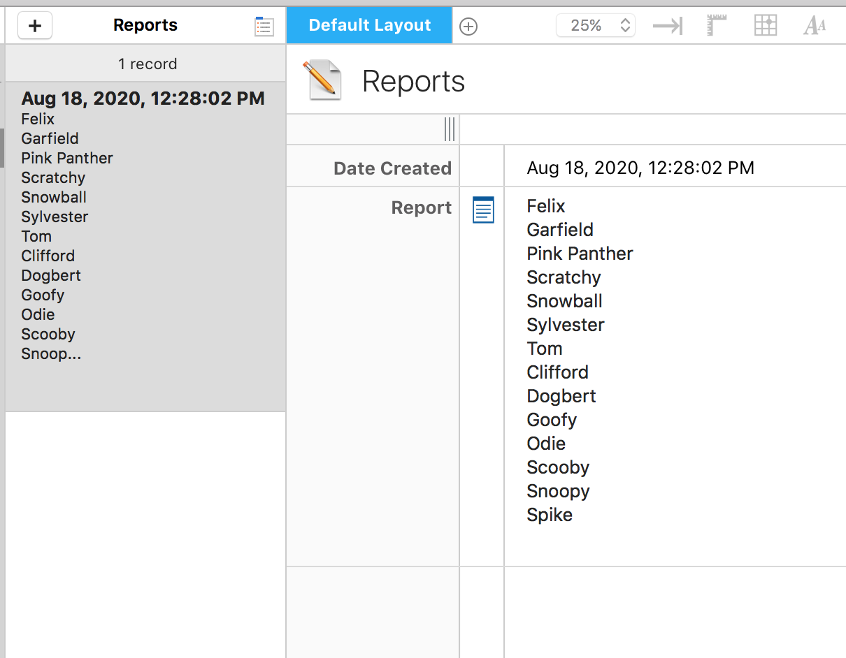 The new record is created, the names of the animals go into the Report field, the Reports form becomes active, and the new record becomes active. It's magic!