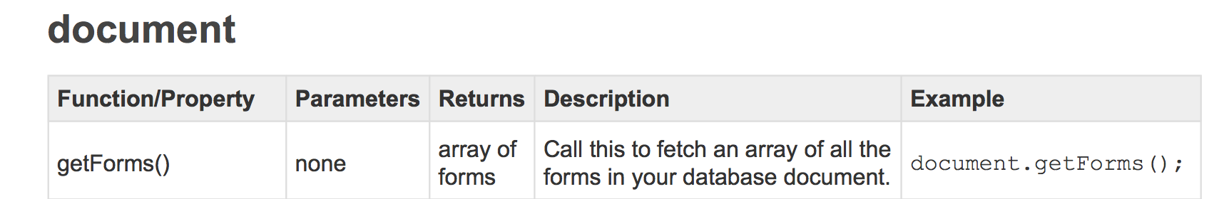 This works because the document object has a getForms() method that returns an array of form objects.