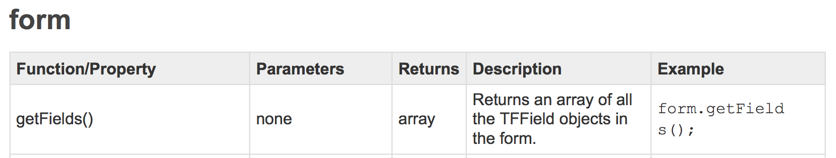 We learned that these are objects we can access, and that each of these objects has methods and properties that we can use, and that these methods and properties are documented in the Tap Forms JavaScript API.