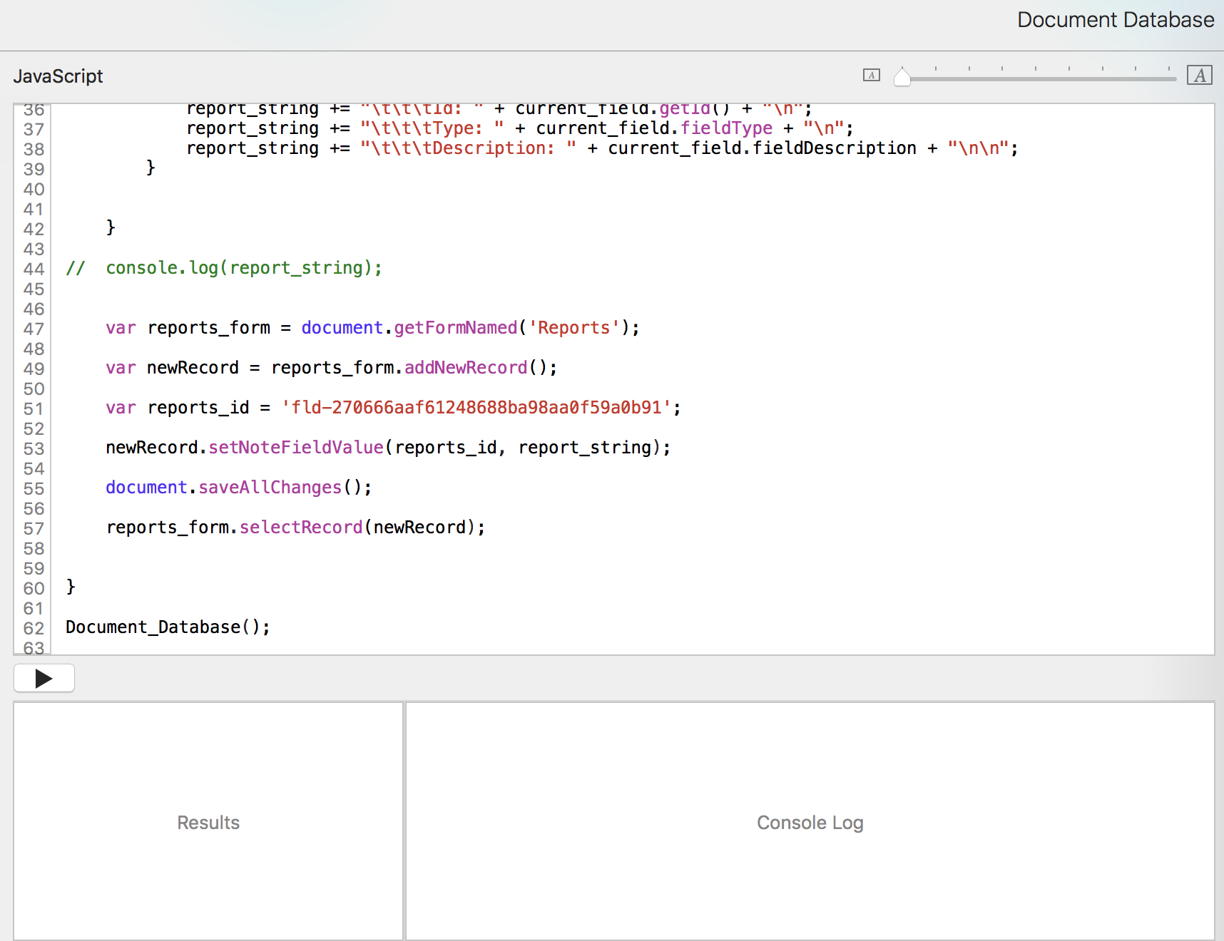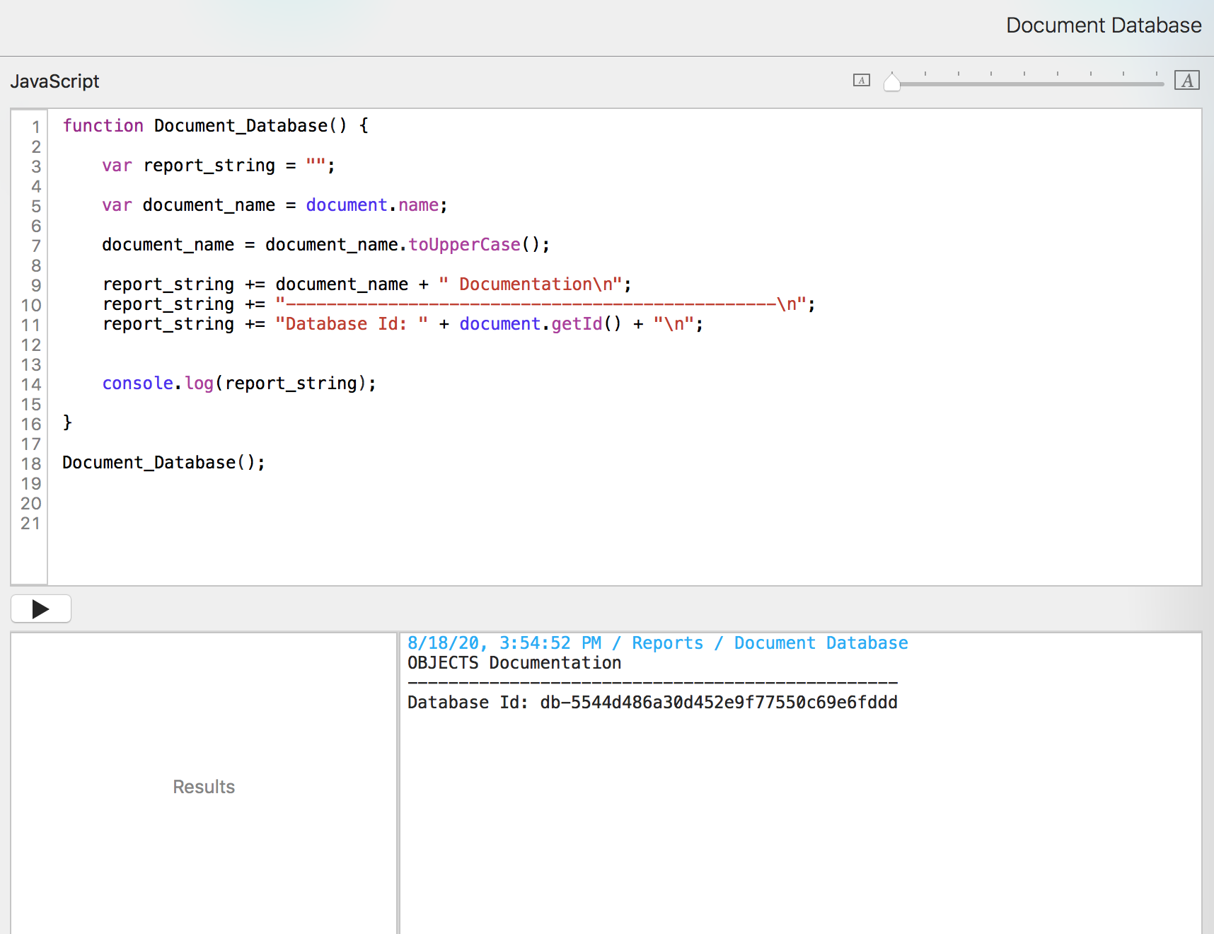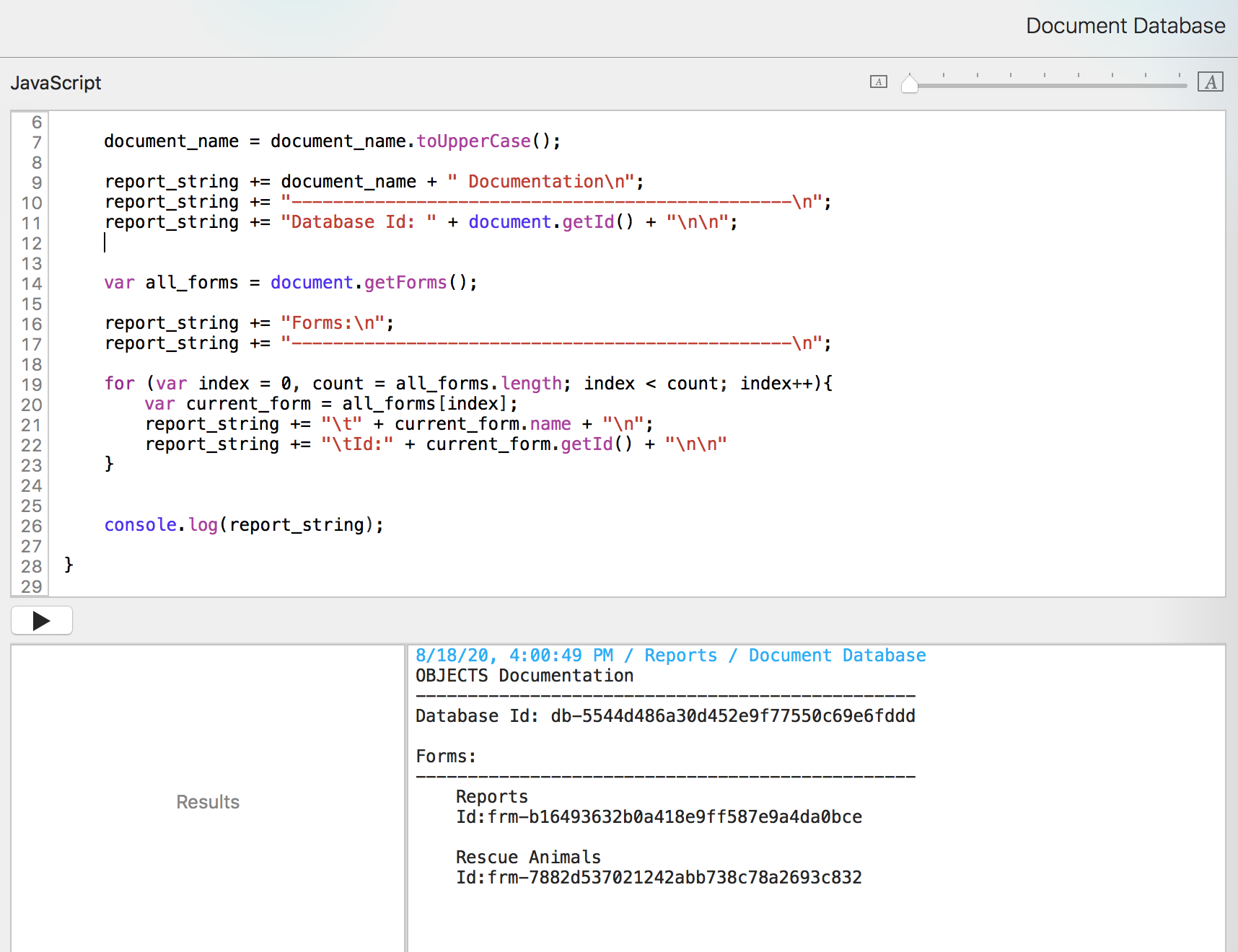 Now we can run the Document Database script from the pulldown and have a new report record.