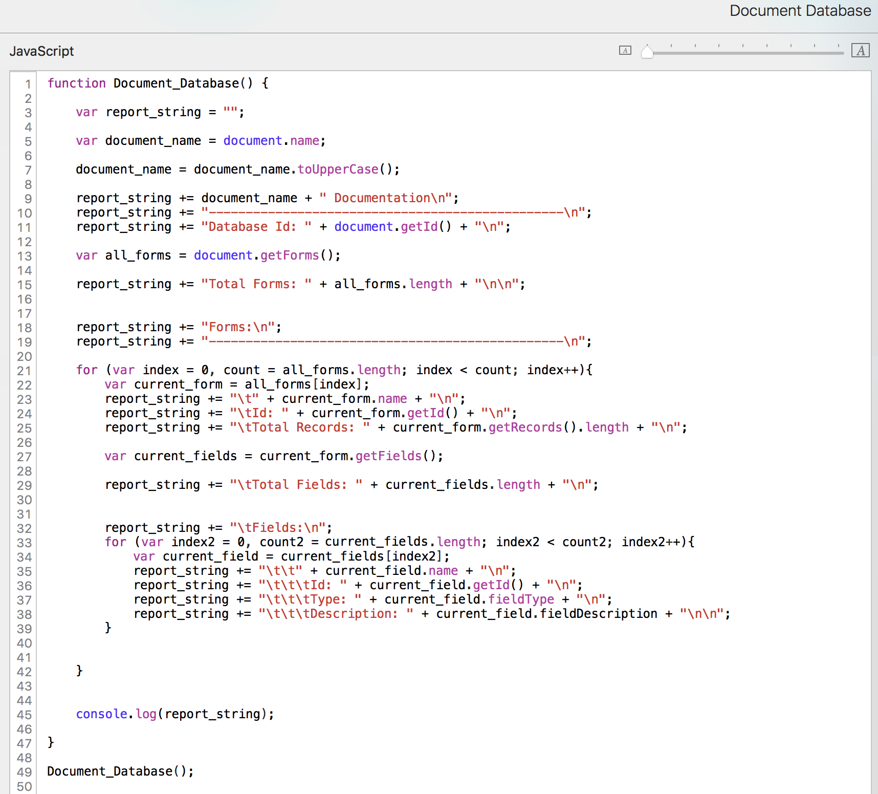 We can use that knowledge to create a report that documents our database for us. Let's start with a simple script framework on our Reports form. We'll eventually create a Reports record and store it there, but for debugging, it's easier to send it to the console.