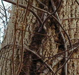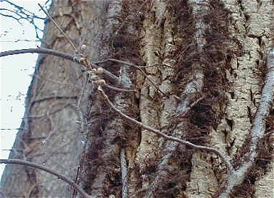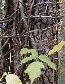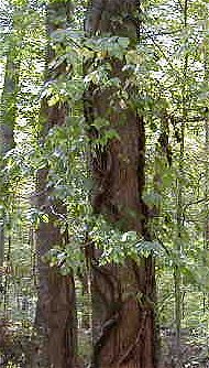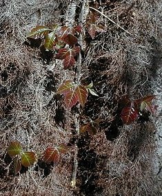 Healthy poison ivy on a tree. - This is some rather old poison ivy as you can tell from the size of the large hairy-looking vines climbing up the tree. Grandfather poison ivy.