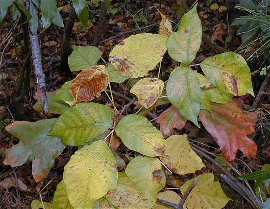 A classic picture of poison ivy. - This is early fall and the leaves are starting to turn colors, but you can see the three leaf configuration clearly as well as the general shape of the leaf. Note that this picture does not have slightly lobed leaves. Some poison ivy does have mild lobes along the leaf edge. You can also see where the stem has been broken and has a black tint to it by the brown leaf. In the background, there's some baby oak trees.