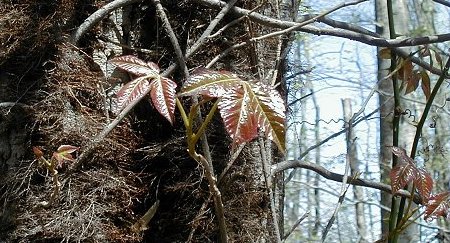New growth in spring. - These are almost hidden against the brown hairy growth. Unfortunately, not all new leaves will have the tell-tale hairy vines right next to it, so look closely at the tiny leaves. They do have the classic three leaf configuration.