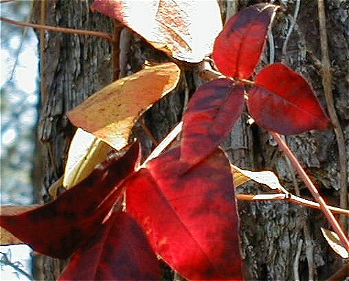 Bright red fall foliage. - These are the typical bright red leaves the identification guides say you can not miss. It took me a while to find some that were red to photograph, as it seems that the first stage is more yellow/orange, moving to red edges, then to full red. Black patches can be seen on the larger leaf in the lower left corner. Roots on the vine in the upper left corner are also indicators that this is poison ivy.