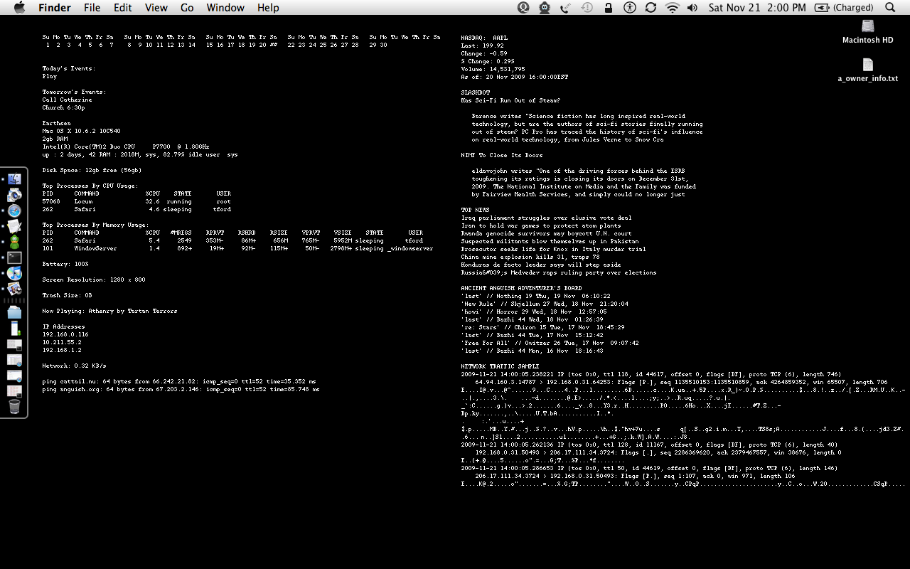 This is my script collection, some written myself and some scrounged from the internet, modified to work (some of them didn't) better (some needed tweaks to be truly useful as GeekTool scripts). You do not need to use GeekTool to use the scripts - they're just useful shell / terminal scripts that display information. While I didn't include any scripts that would harm your system, prudent computer users always read scripts from the Internet before they run them (you, not me and mine, are responsible for your actions).