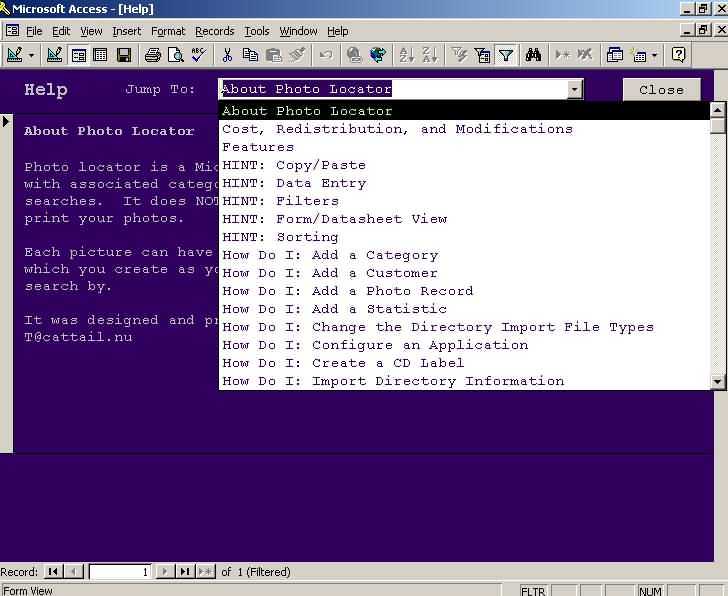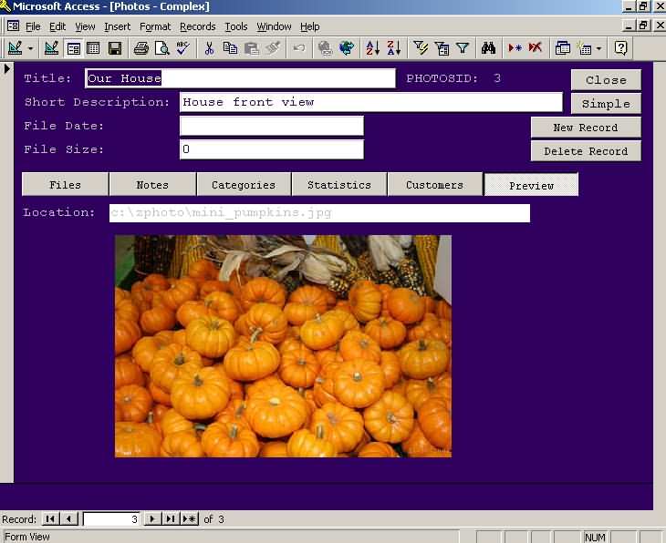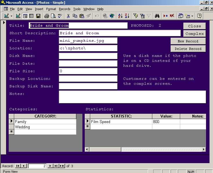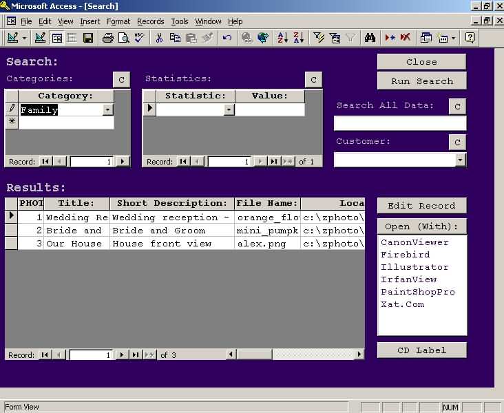 Challenge: This database was created, start to finish in a couple hours, on a challenge. About: This is a free MS Access database for categorizing, describing, and finding your digital photographs. Add categories, statistics, and customers to the file name, directory (and disk) and easily search on anything. It comes with instructions and help. Features: Store the file and path for any file type. Configure your favorite applications to launch with the located photo. Keep notes and backup locations on your files. System Requirements: Microsoft Access 97+ Screen Shots: Download - Unzip the files into a c:\zphoto\ directory (this can be customized). |