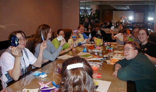 A picture of my basic origami class at Evecon, January 2000. - At the end of this class, we each folded one of Tomoko Fuse's turtles (modular pieces) so we could assemble it and put it in the convention's art show. In the advanced class, we were a bit too busy folding Tom Stamm's dragon to take pictures.