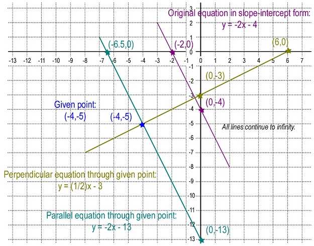 Write a slope-intercept equation for a line passing through the given point that is parallel to the given line. Then write a second equation for a line passing through the given point that is perpendicular to the given line.