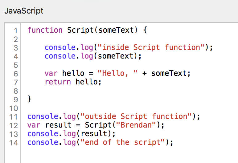 I shall replace Script("Brendan") with the function's return value - "Hello, Brendan" and I will store that in the variable named result.
