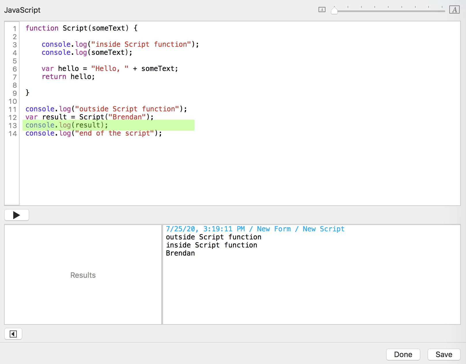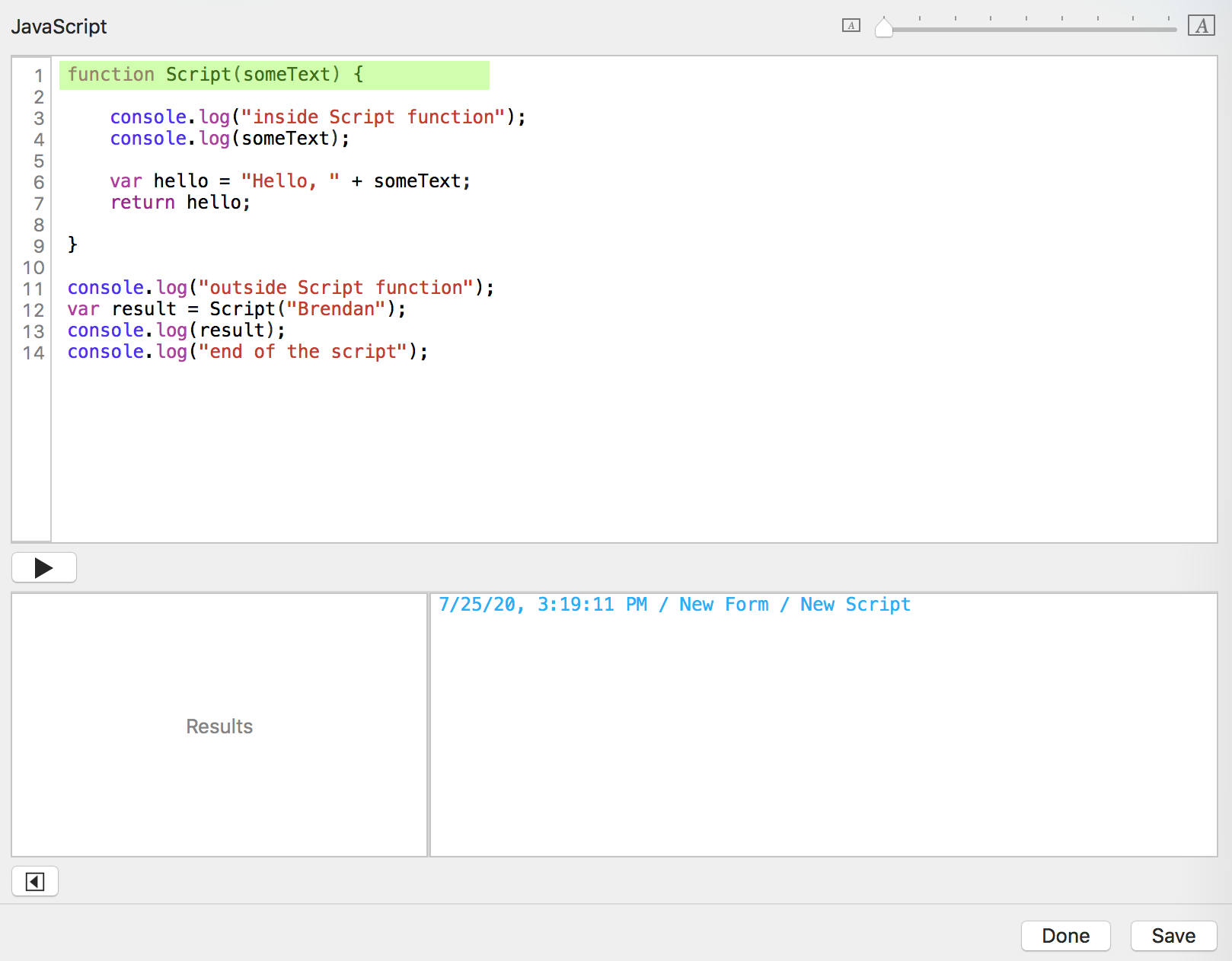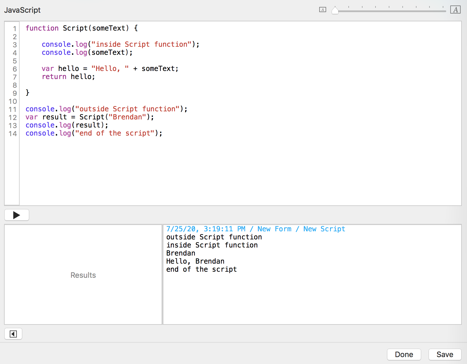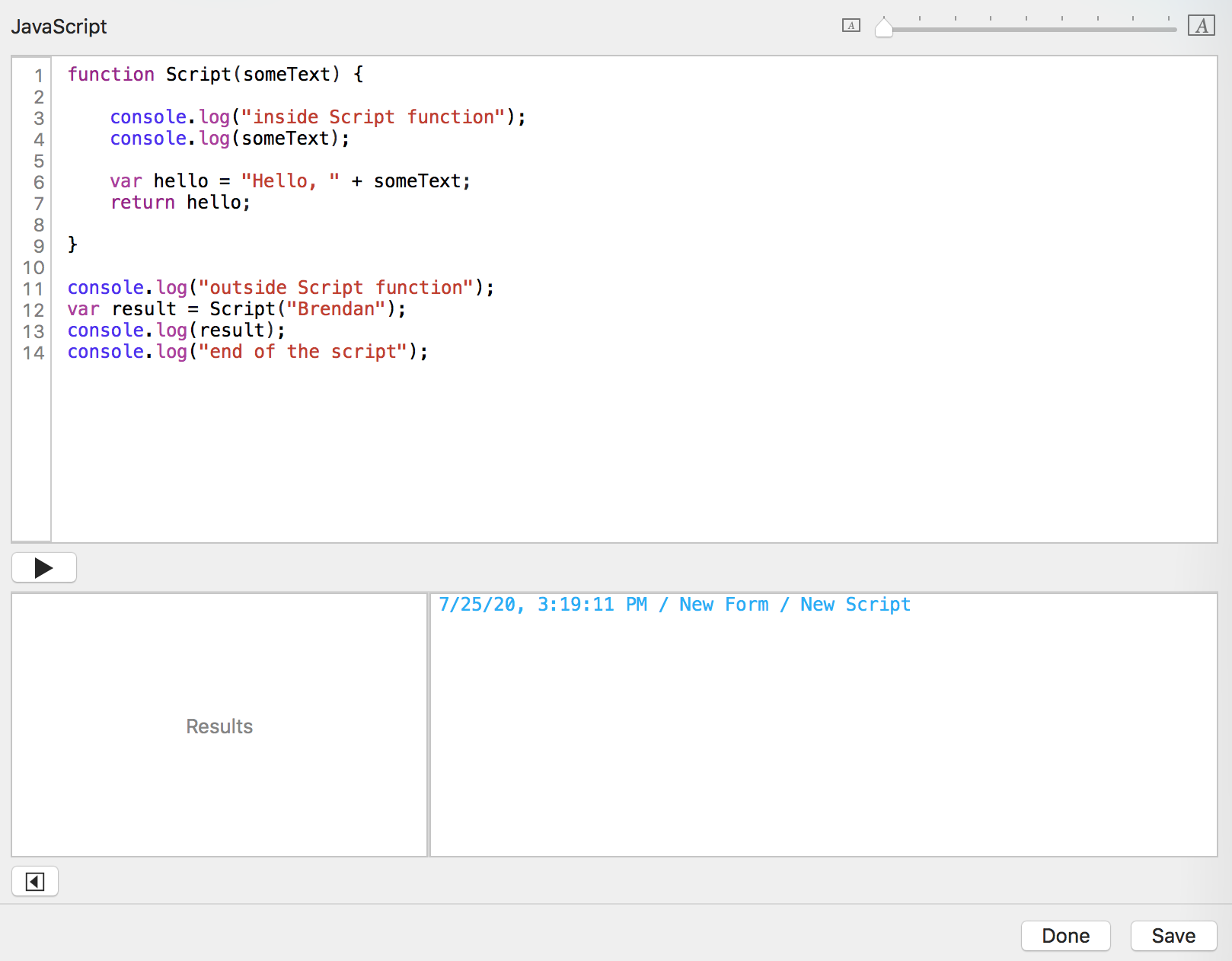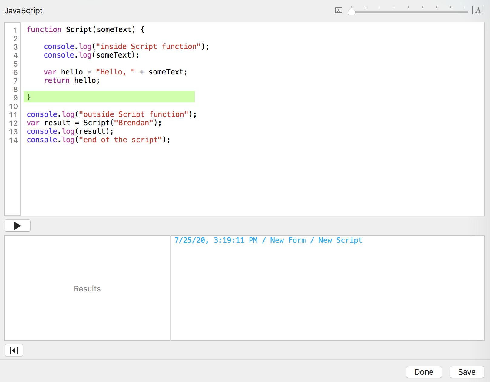 You click the "Run script" button. Tap Forms sends the date, time, form name, and script name to the console log window.