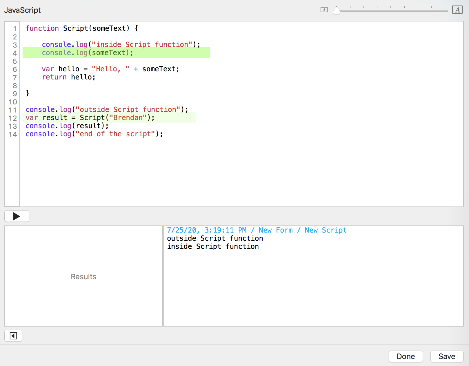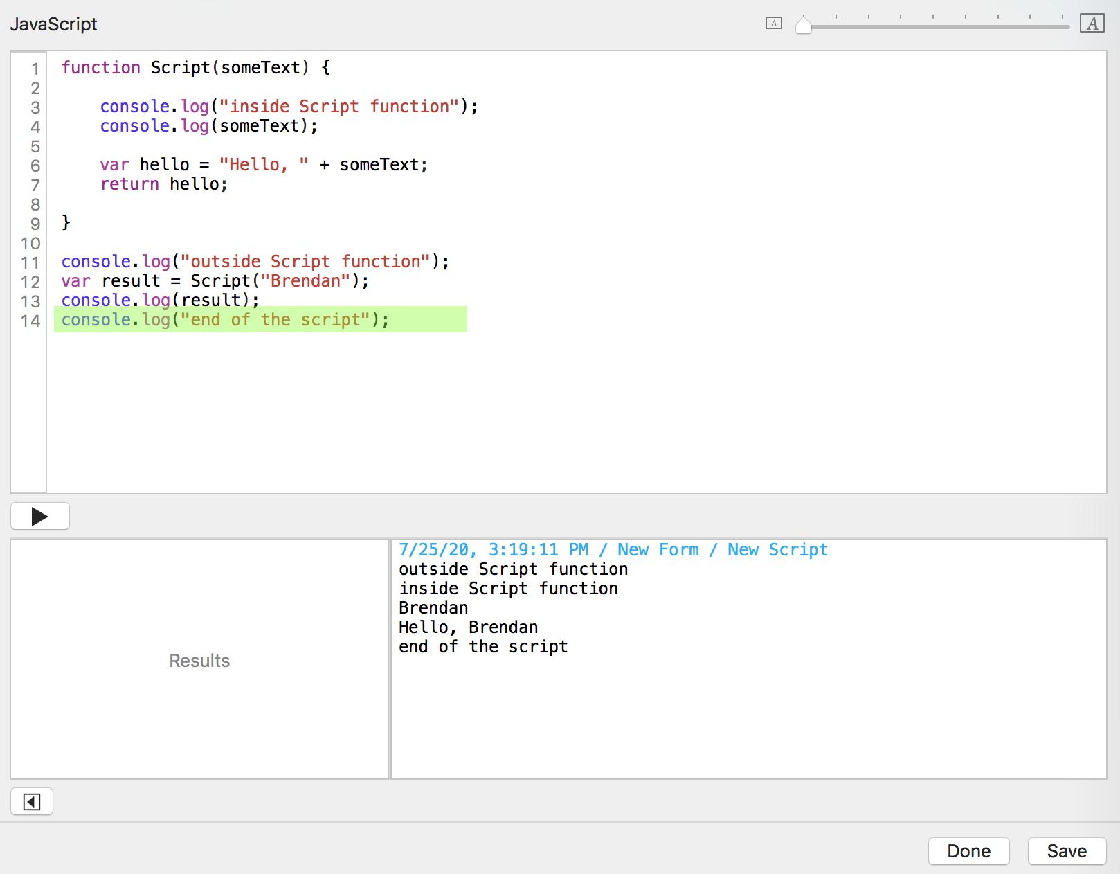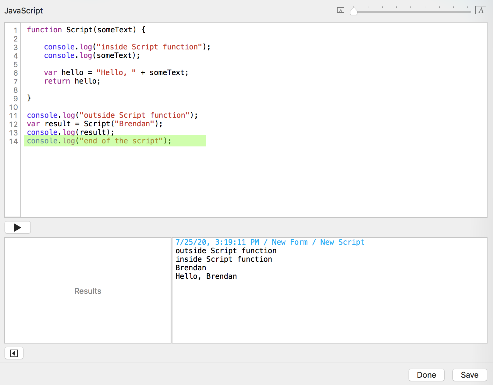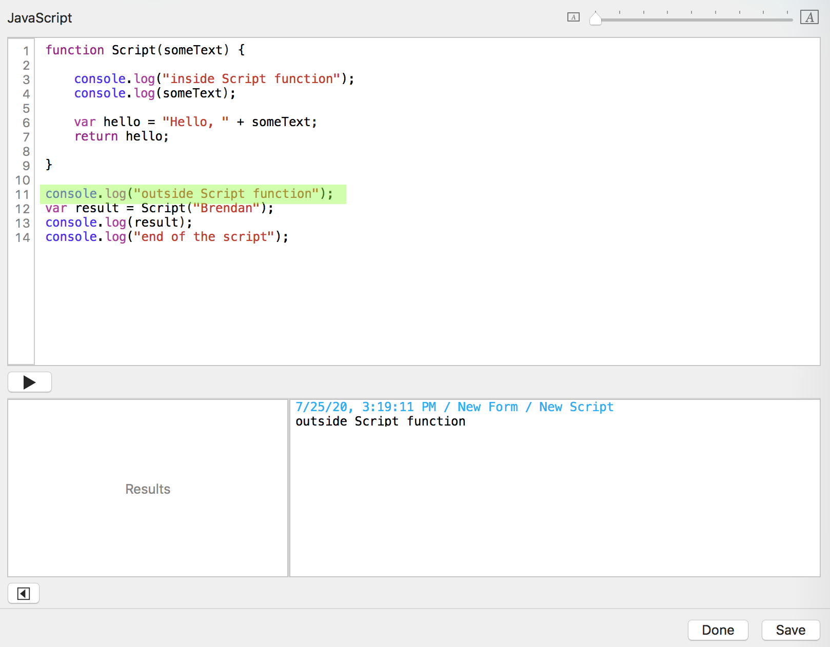 You click the "Run script" button. Tap Forms sends the date, time, form name, and script name to the console log window.