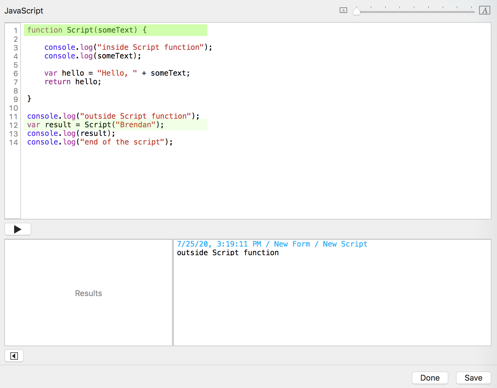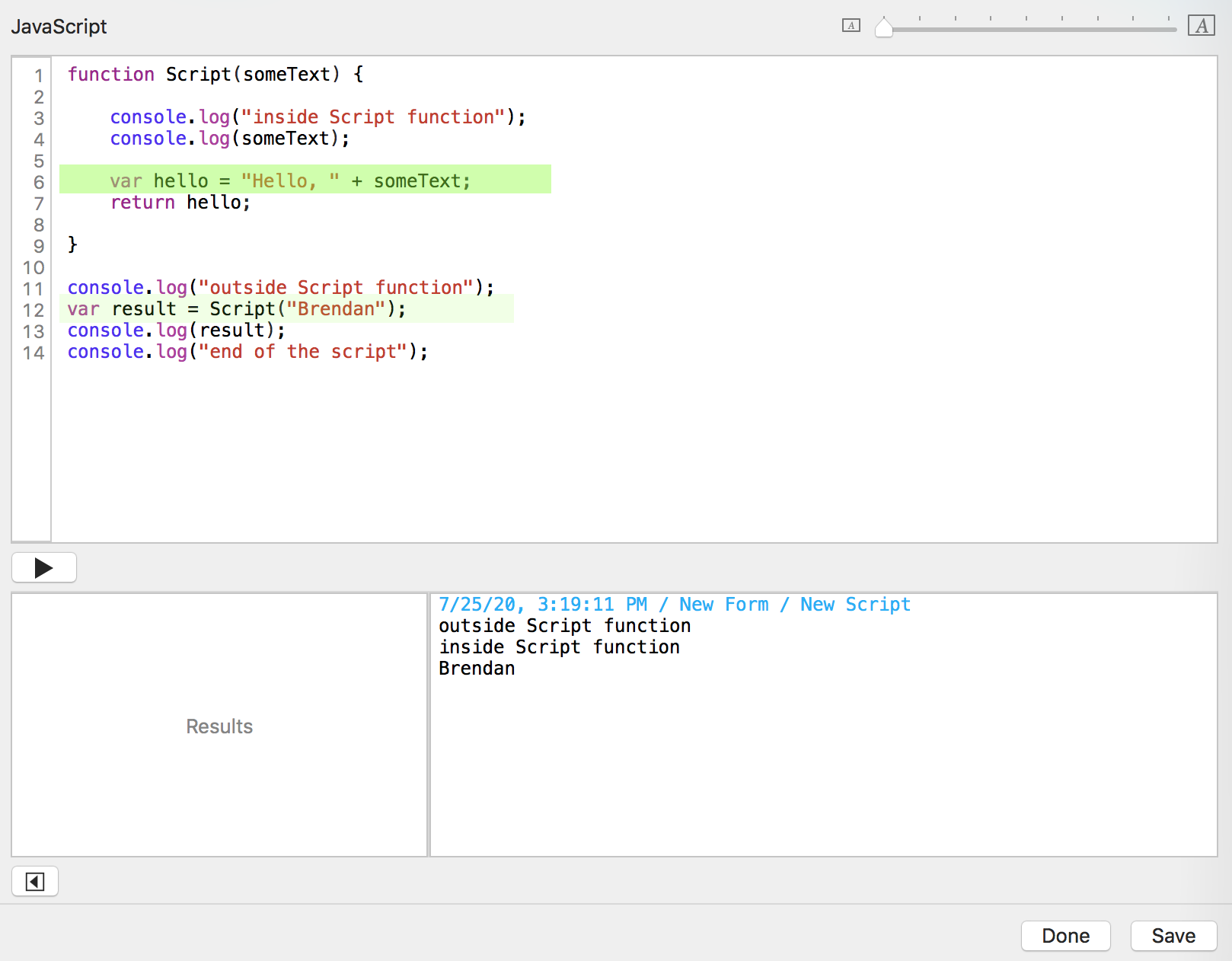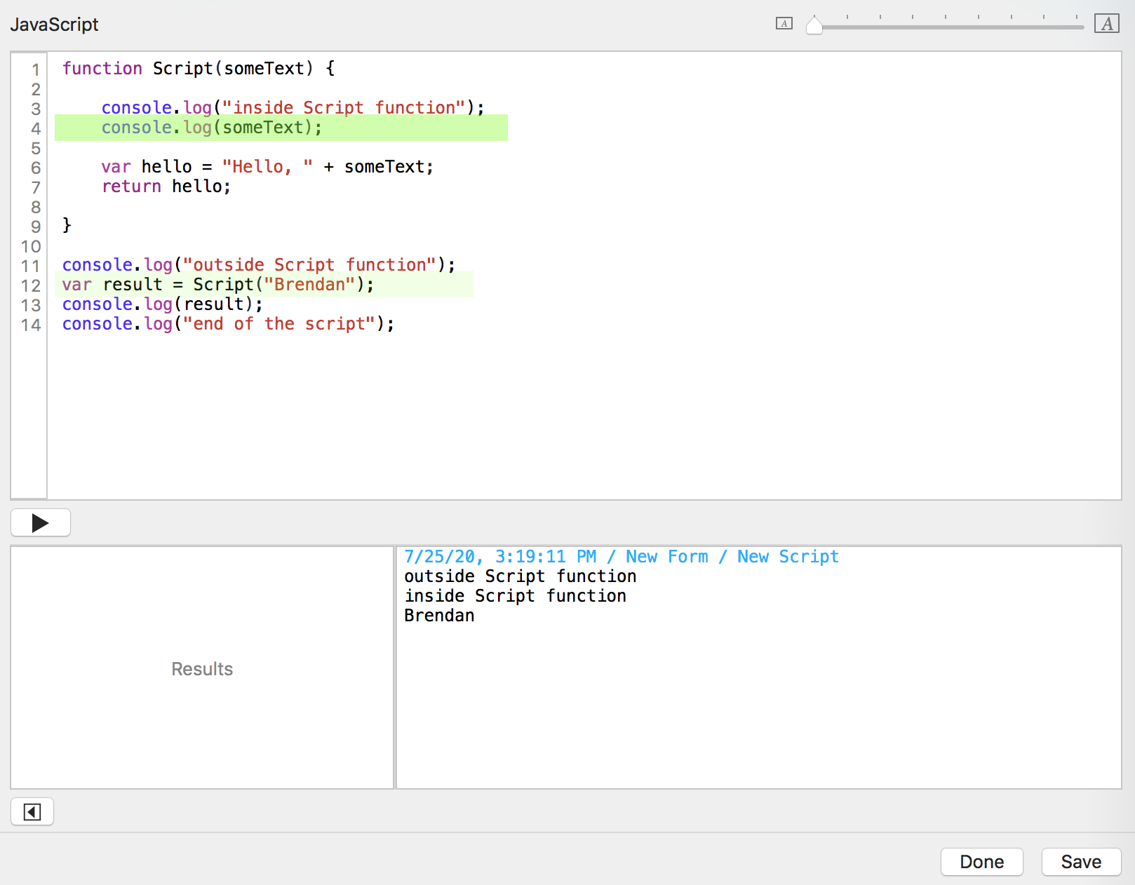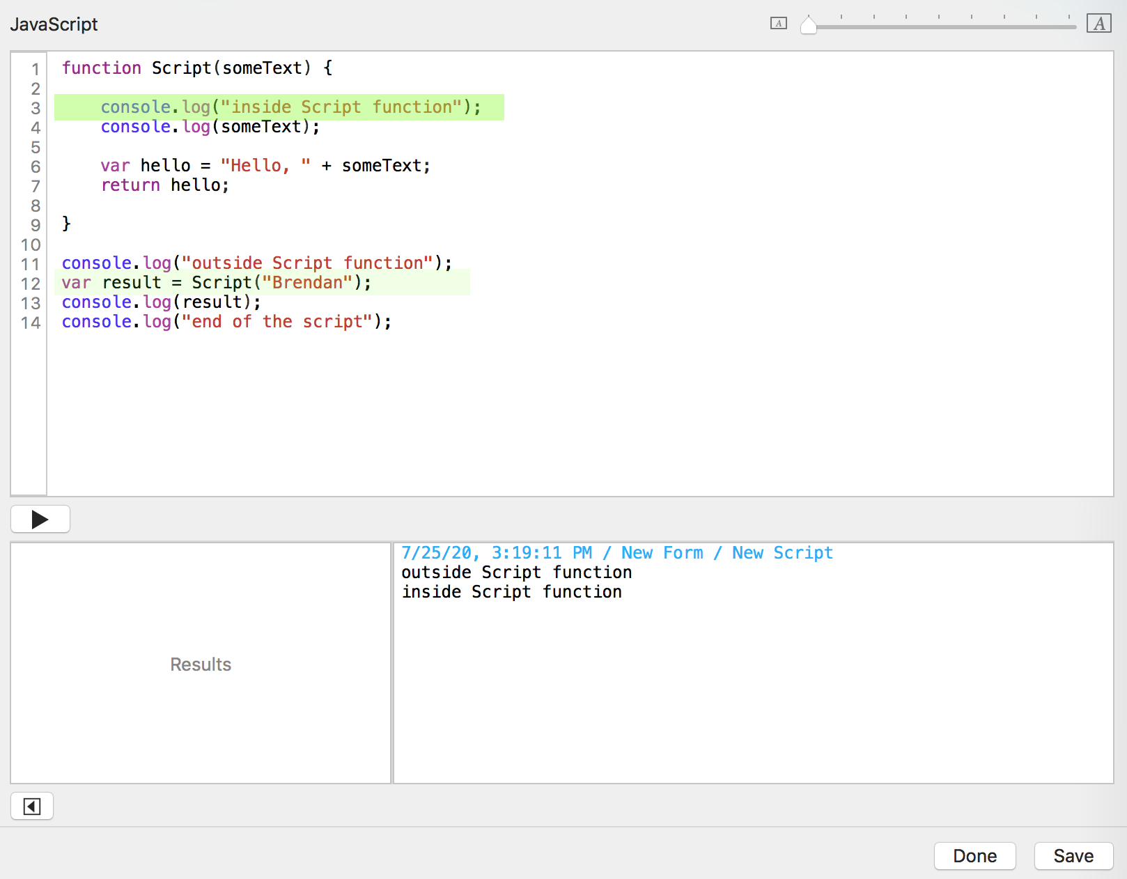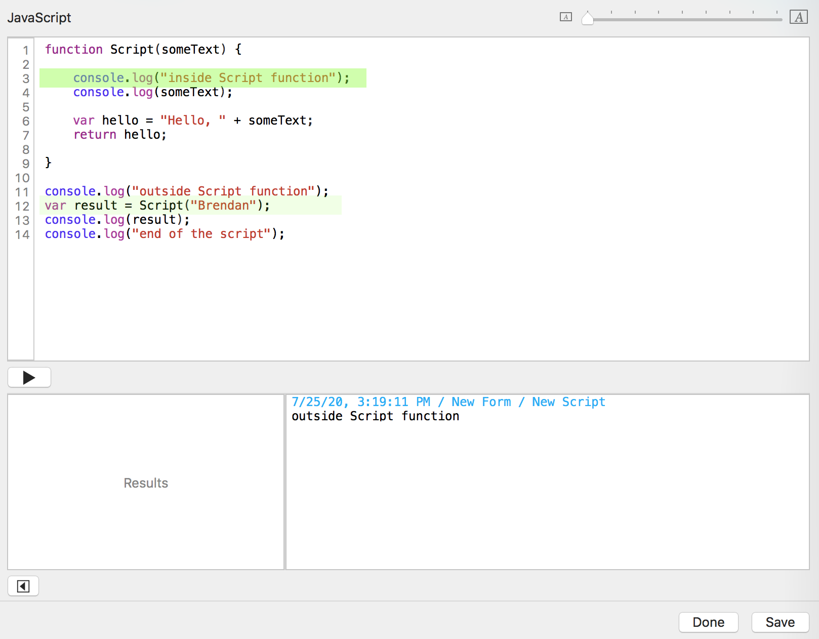 You click the "Run script" button. Tap Forms sends the date, time, form name, and script name to the console log window.